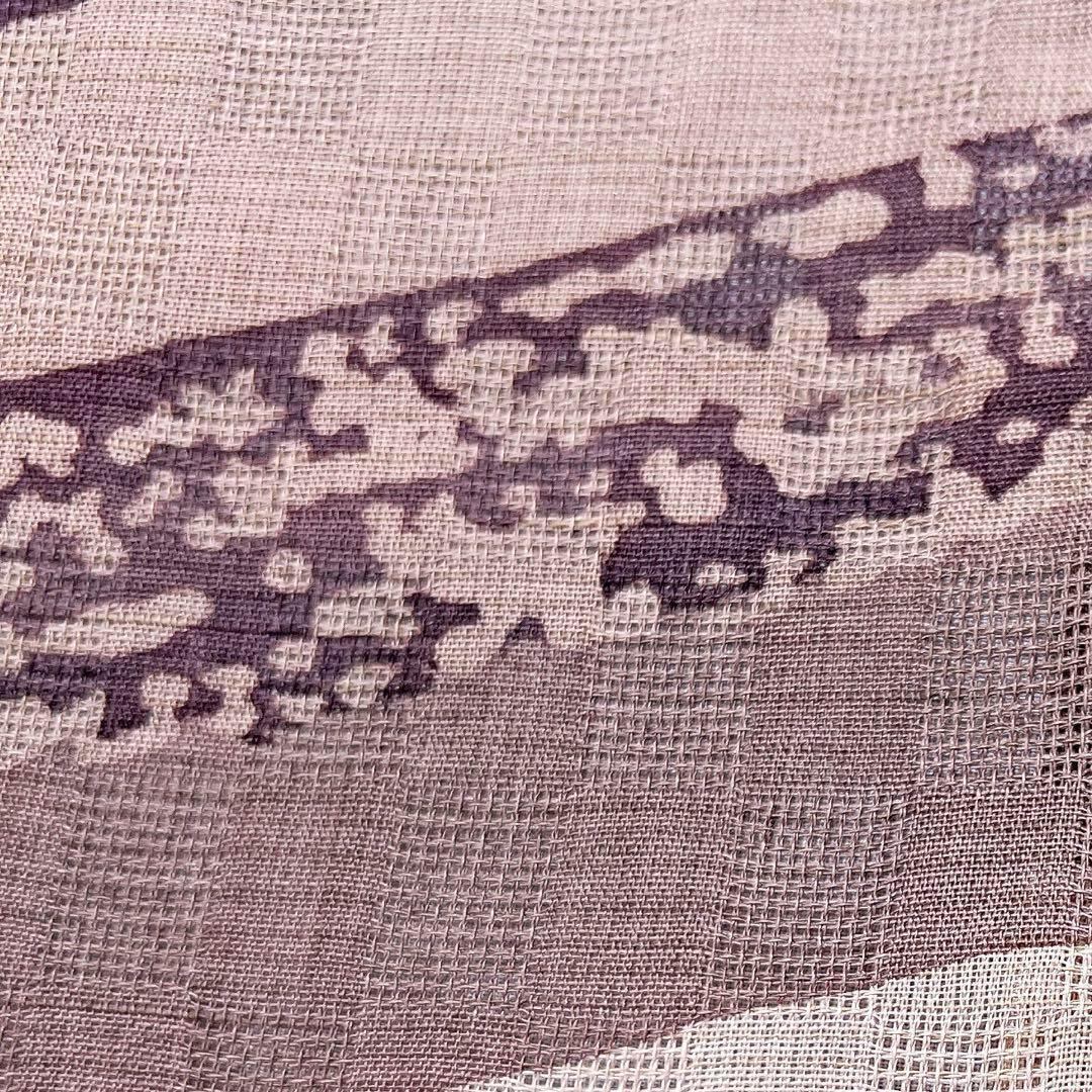 手描きローケツの様々な紫色に斜め抽象模様が華やかでお洒落な一着です。