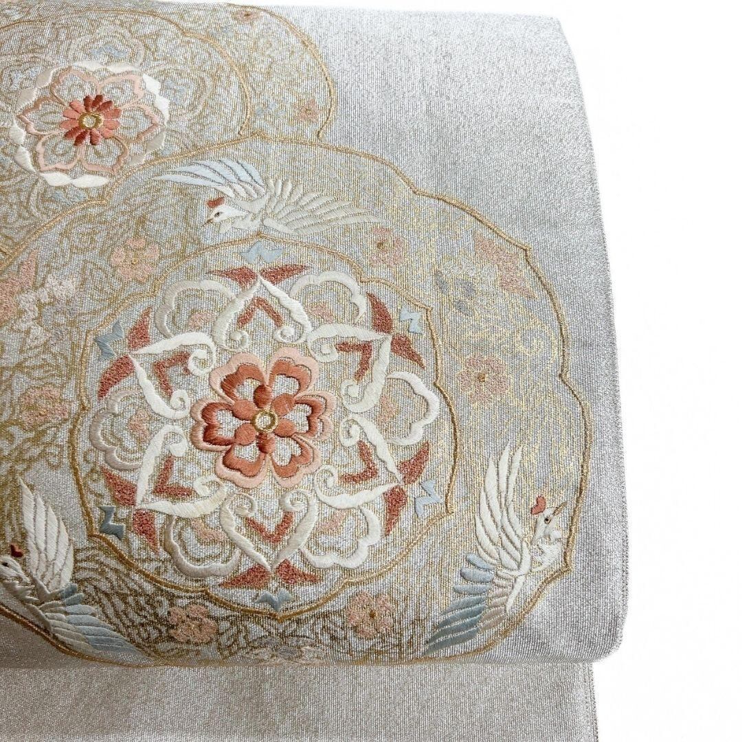 綴れ織に刺繍で華紋や鳳凰がデザインされた袋帯です。