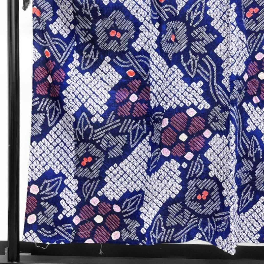 藍色地に有松鳴海絞りで描かれた花模様と朝顔に鹿の子の文様がお洒落なデザインの一着です。