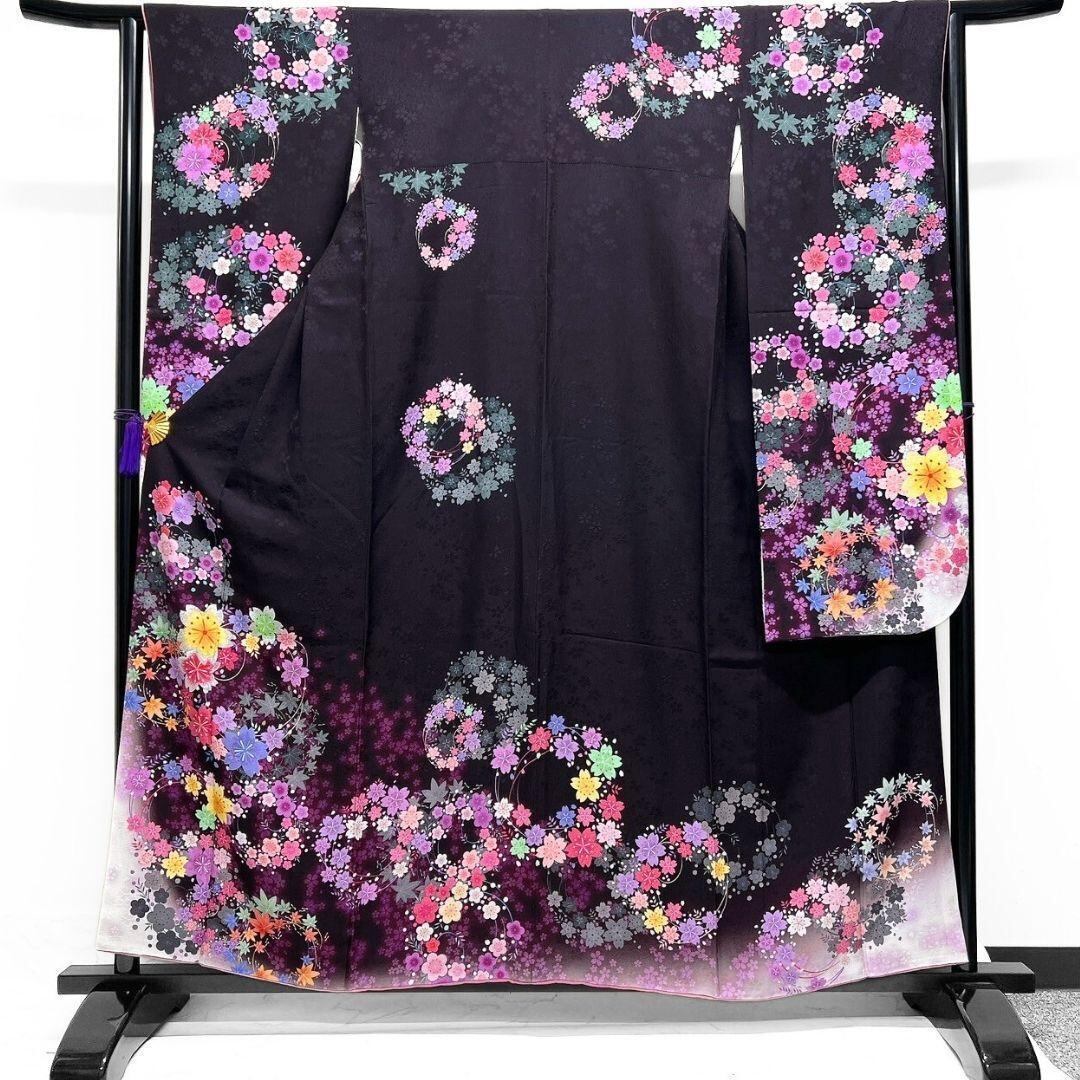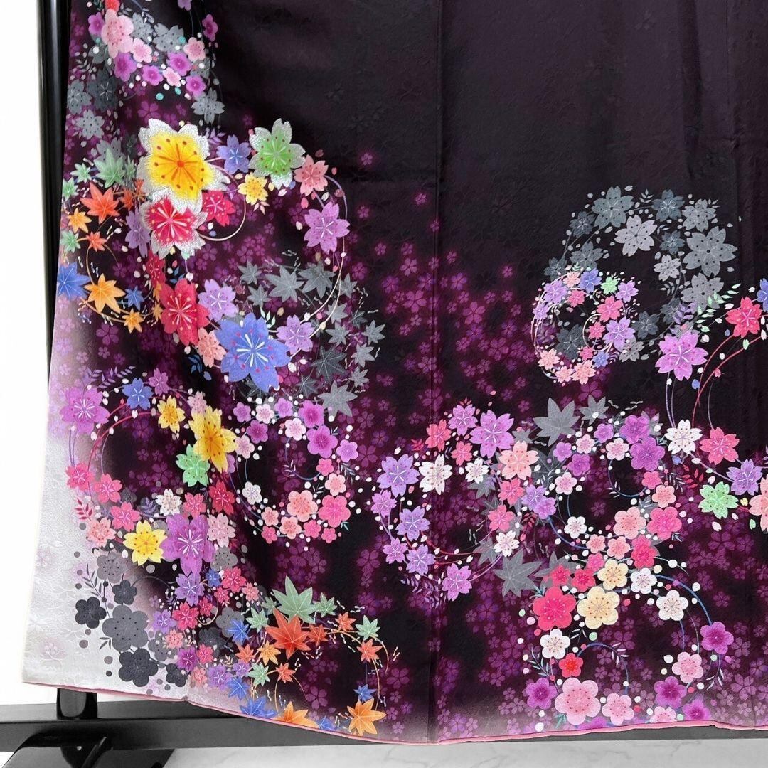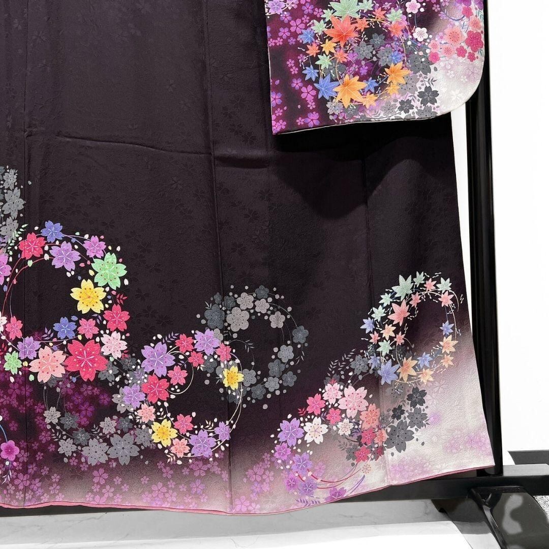 桜花模様や楓などの花紋や花輪が鮮やかに描かれた、晴れやかなデザインの1着です。
