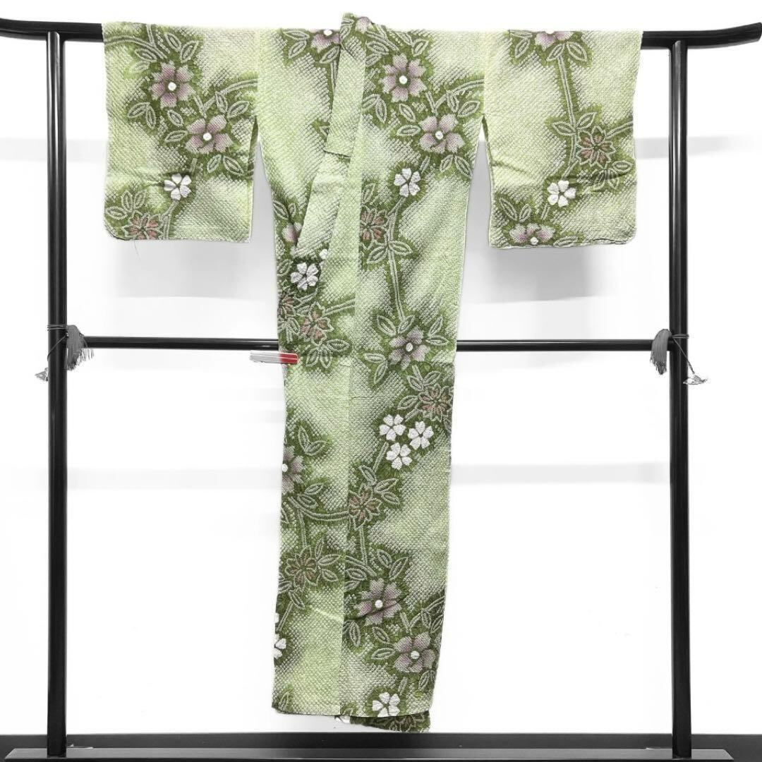 有松鳴海絞りの浴衣です。抹茶色と明るい黄緑のグラデーションに縦縞に伸びた花模様が鮮やかで美しい一本となっております。