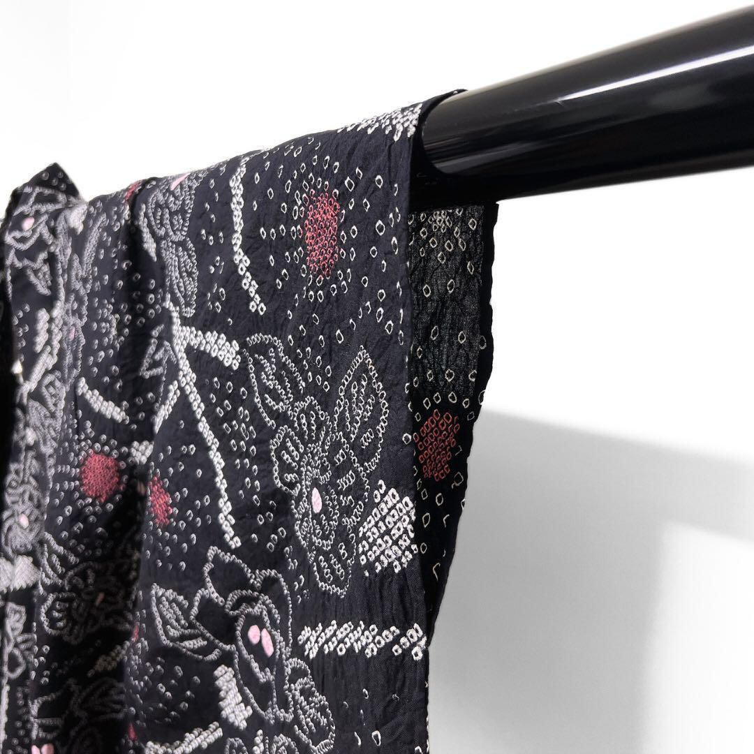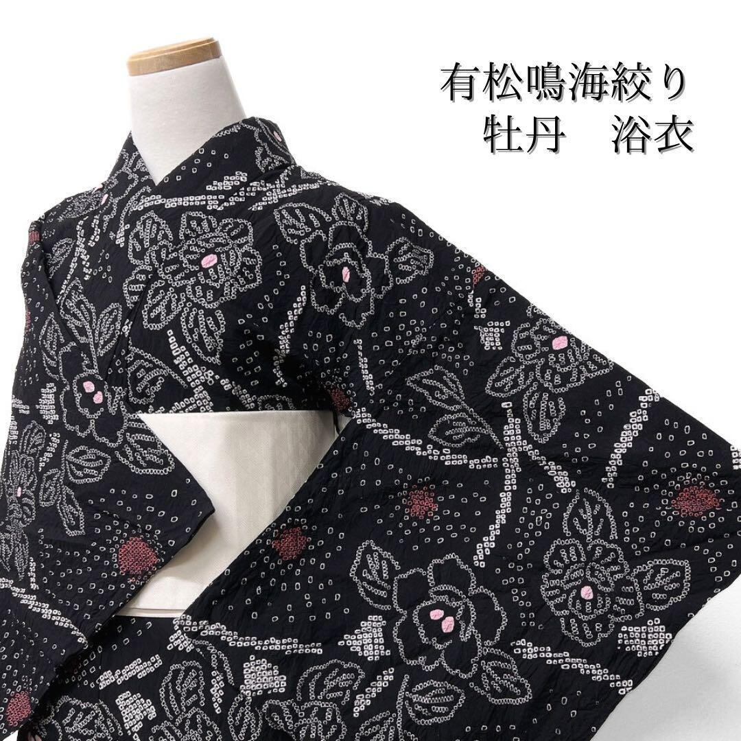 黒地に有松鳴海特有の絞りに牡丹と抽象花がお洒落な一着です。