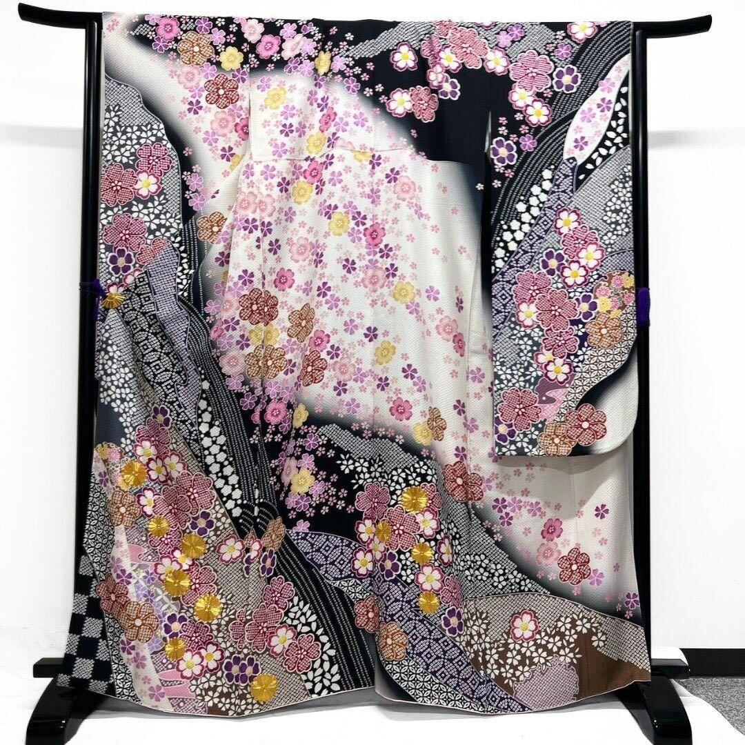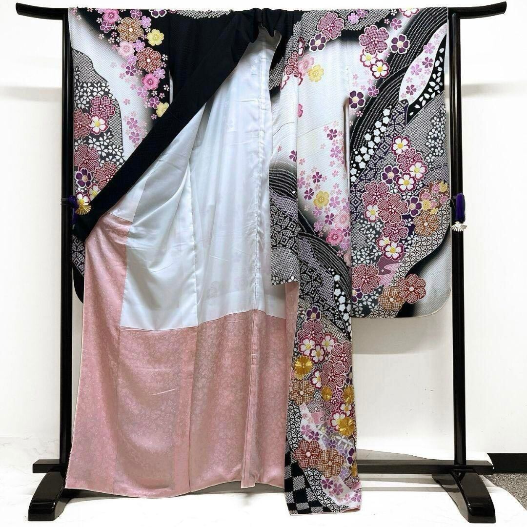 金駒刺繍 エンボス加工 菊花 市松模様 七宝 振袖 着物 104a p