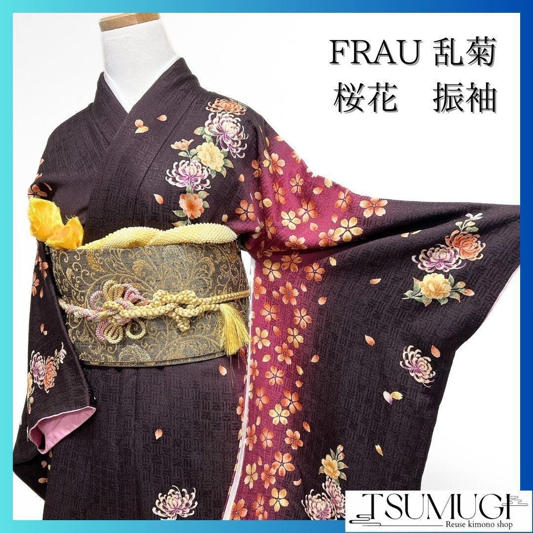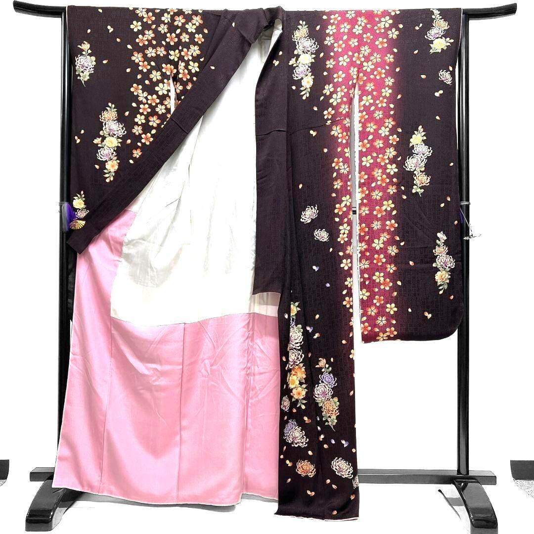 チョコレートカラーに華やかな花模様が美しい1着です。