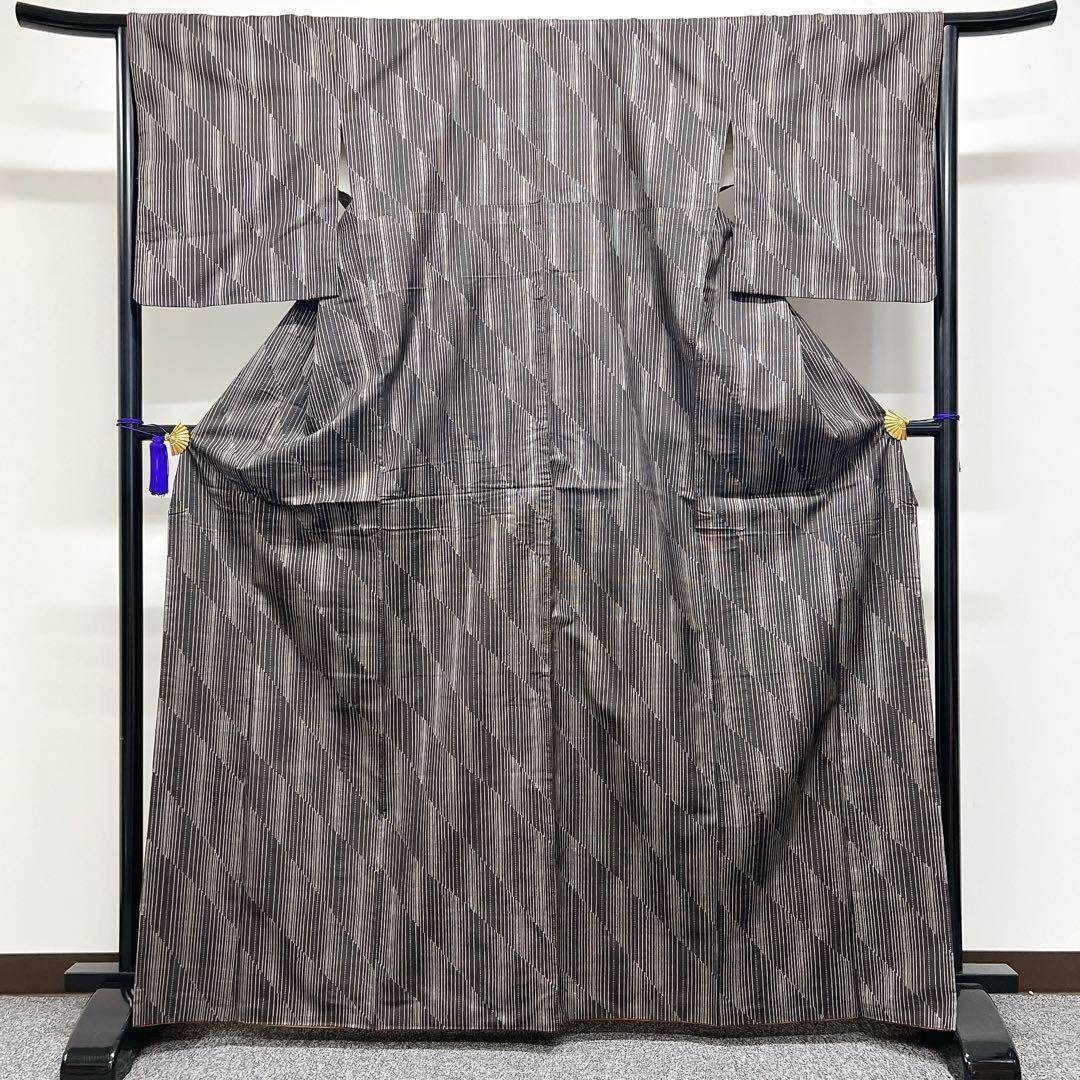 泥染の大島紬に斜め段に細やかに織られた様々な縦縞模様がお洒落な一着です。