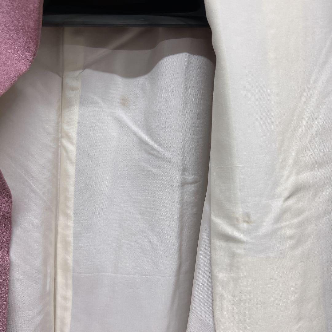 裏地に薄くと襟山に縦線状のごく薄い汚れがございます。