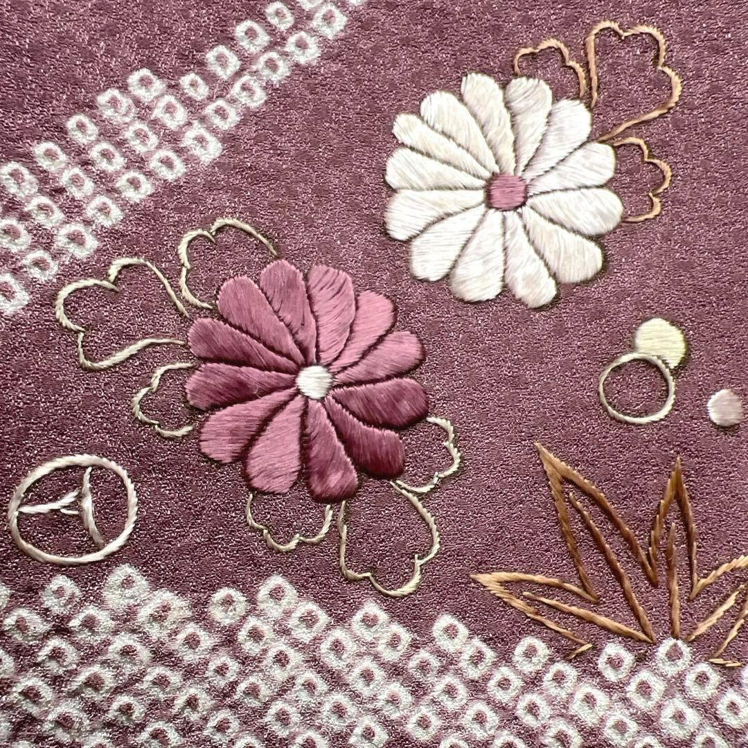 くすみのある紫地に絞りの文様と刺繍で織られた菊花や楓の文様が華やかな一着です。