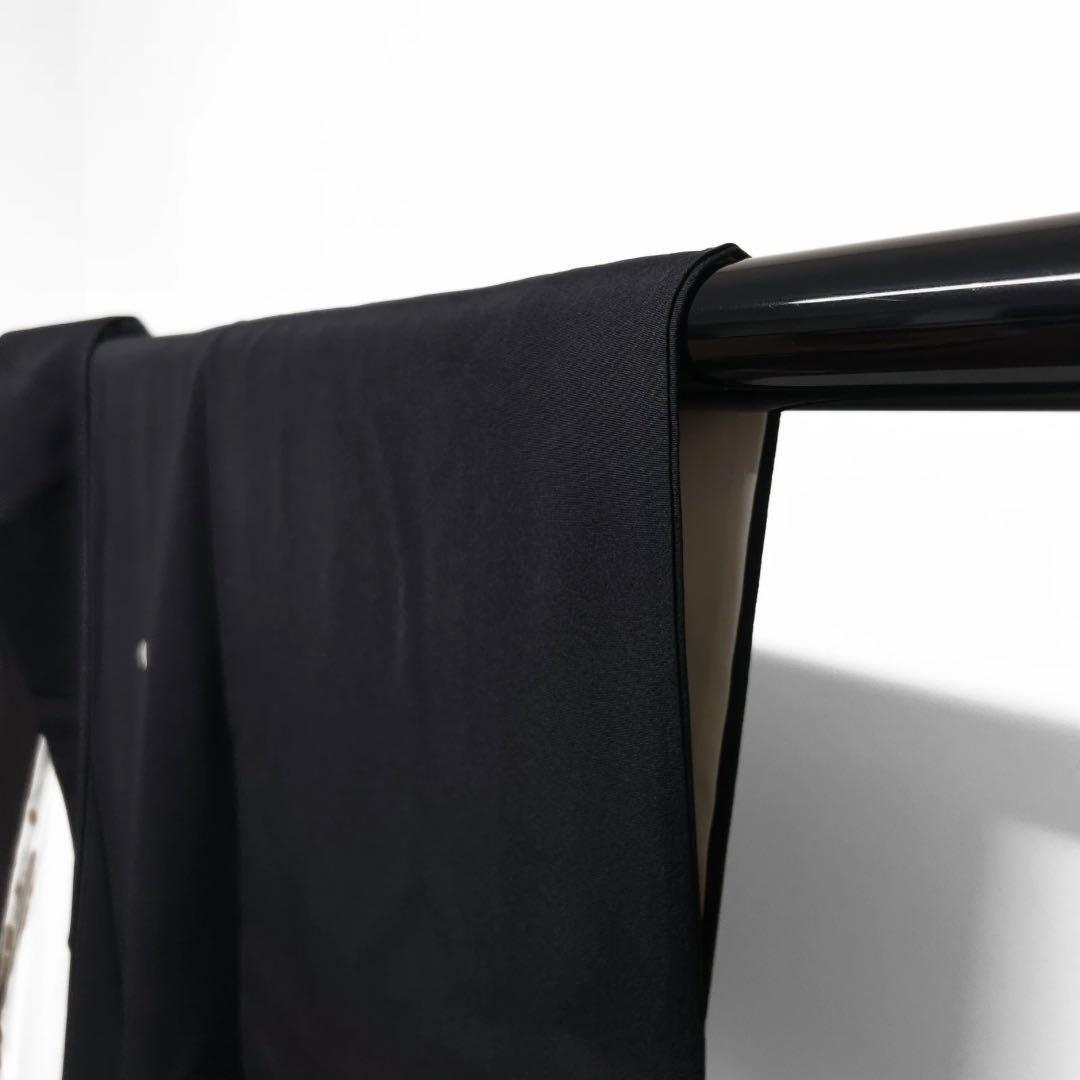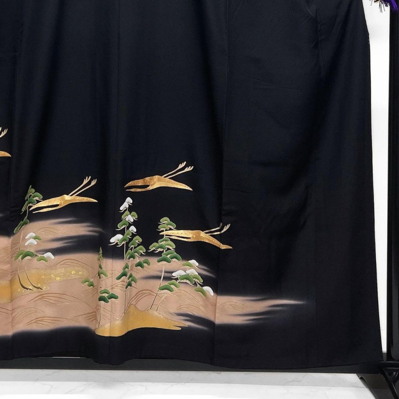 黒地に金駒刺繍の鶴と金彩を交えて描かれた波と松が華やかなデザインの一着です。