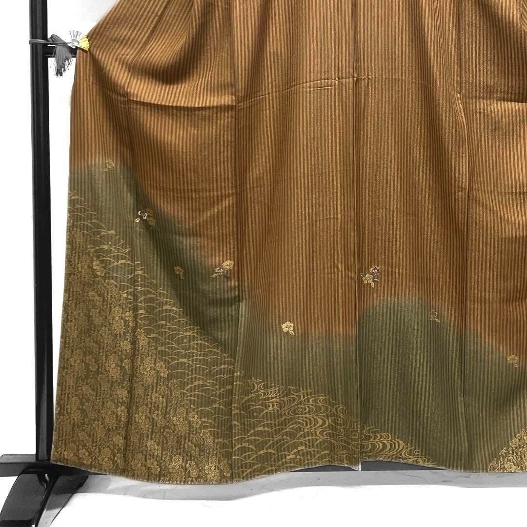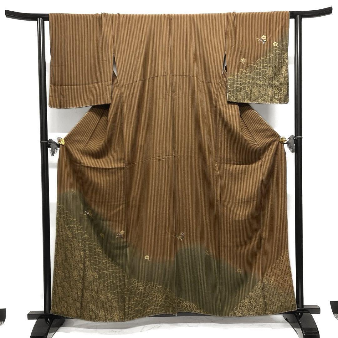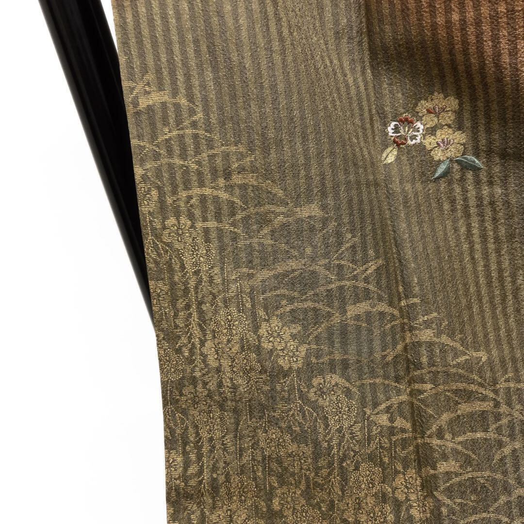 ブラウンの縦縞に金彩と刺繍の桜や露芝模様が華やかなデザインの一着です。