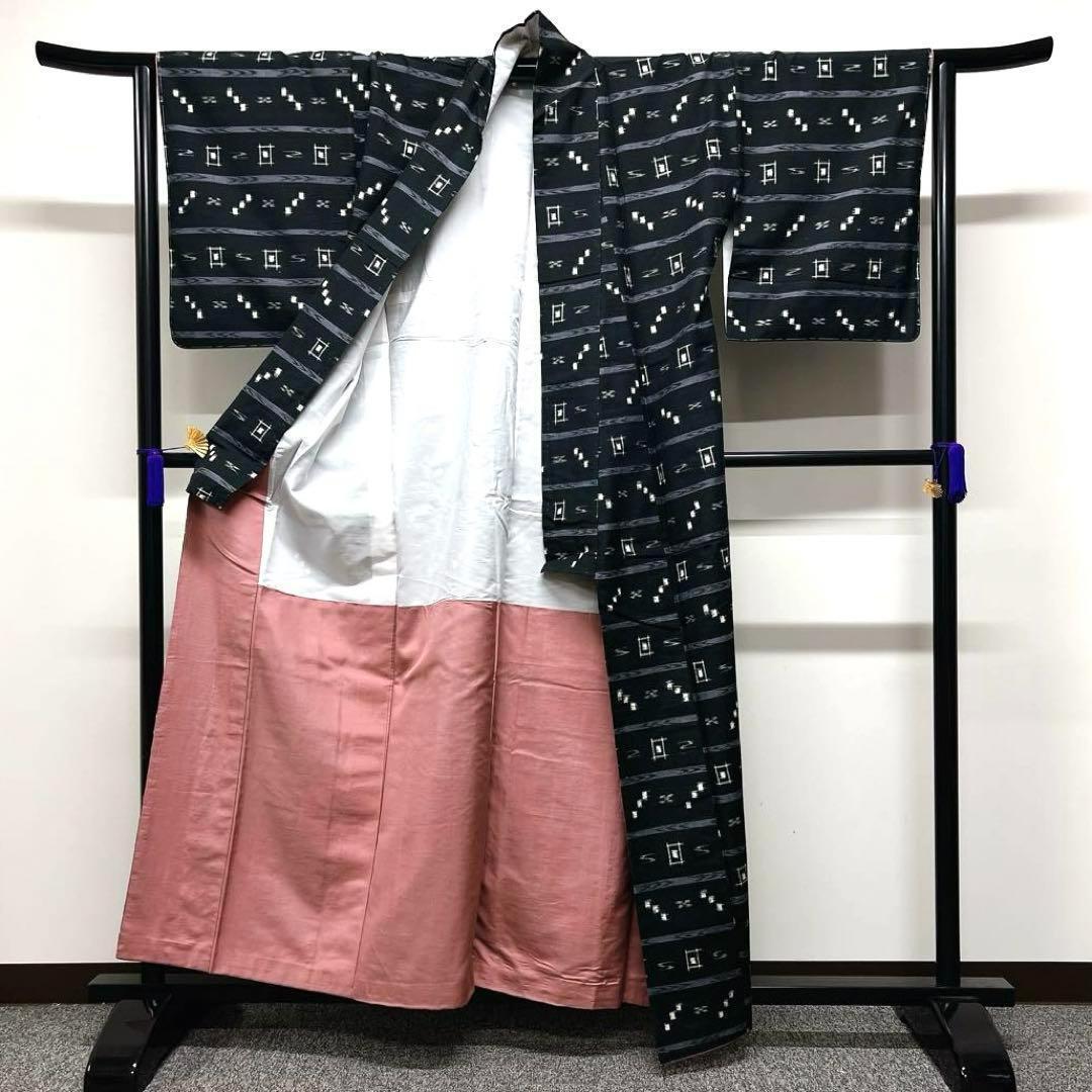 紬の黒地にグレーの横縞と白の流線模様と幾何学模様がお洒落な一着です。