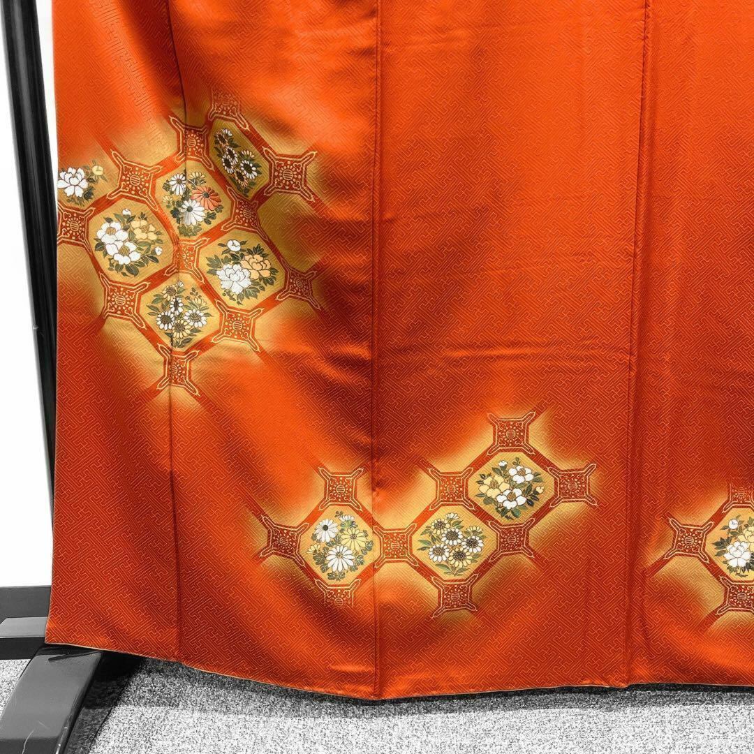 鮮やかなお色味に金の格子模様、刺繍であしらわれた椿模様や牡丹模様が美しいデザインの1着です。