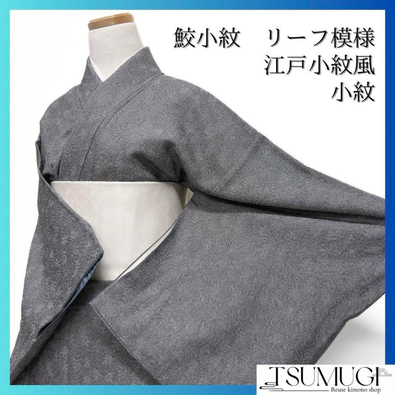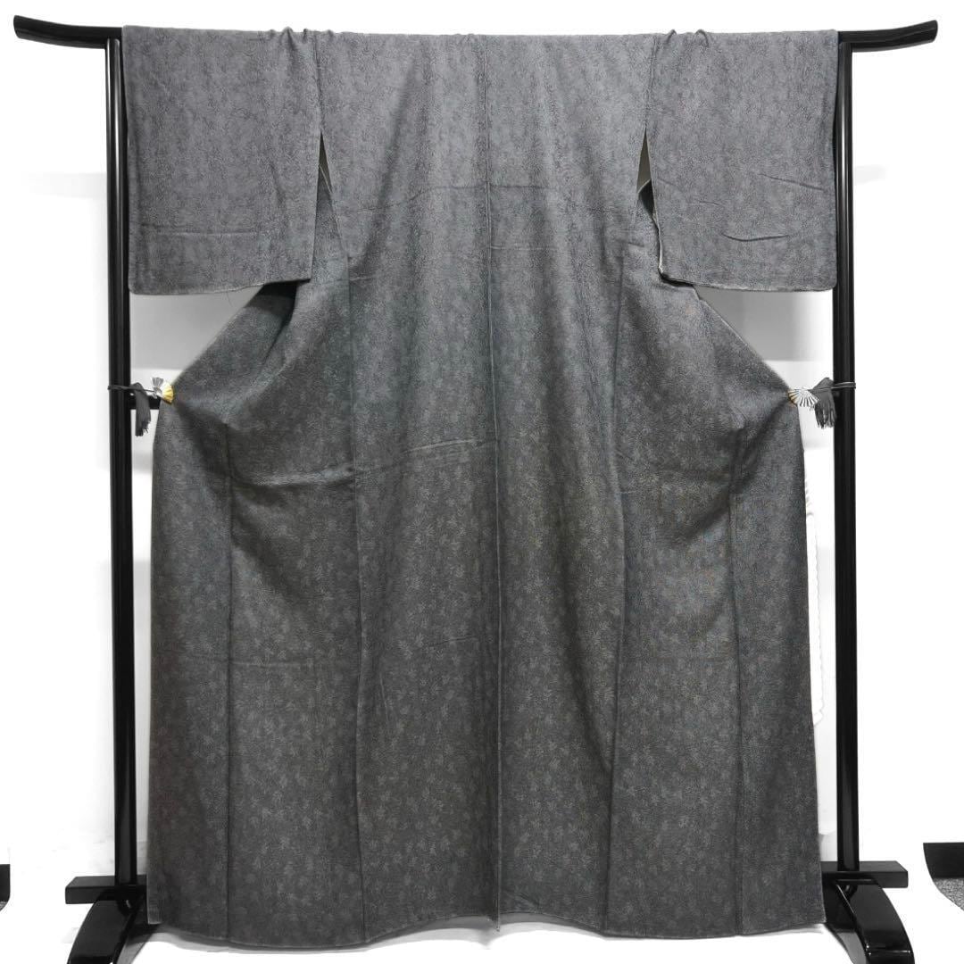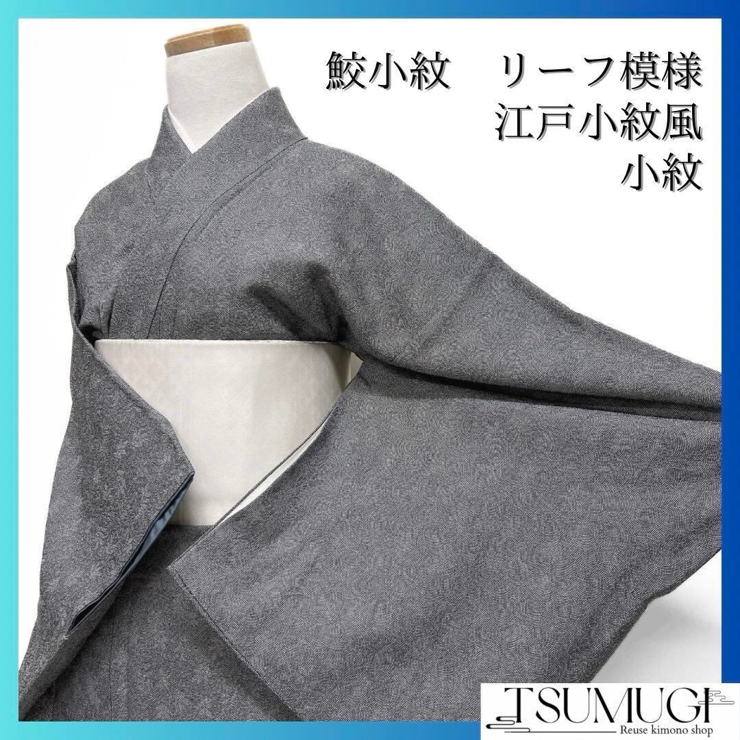 江戸小紋風に細やかにモノトーンで織られた鮫小紋にリーフの文様がお洒落なデザインの一着です。