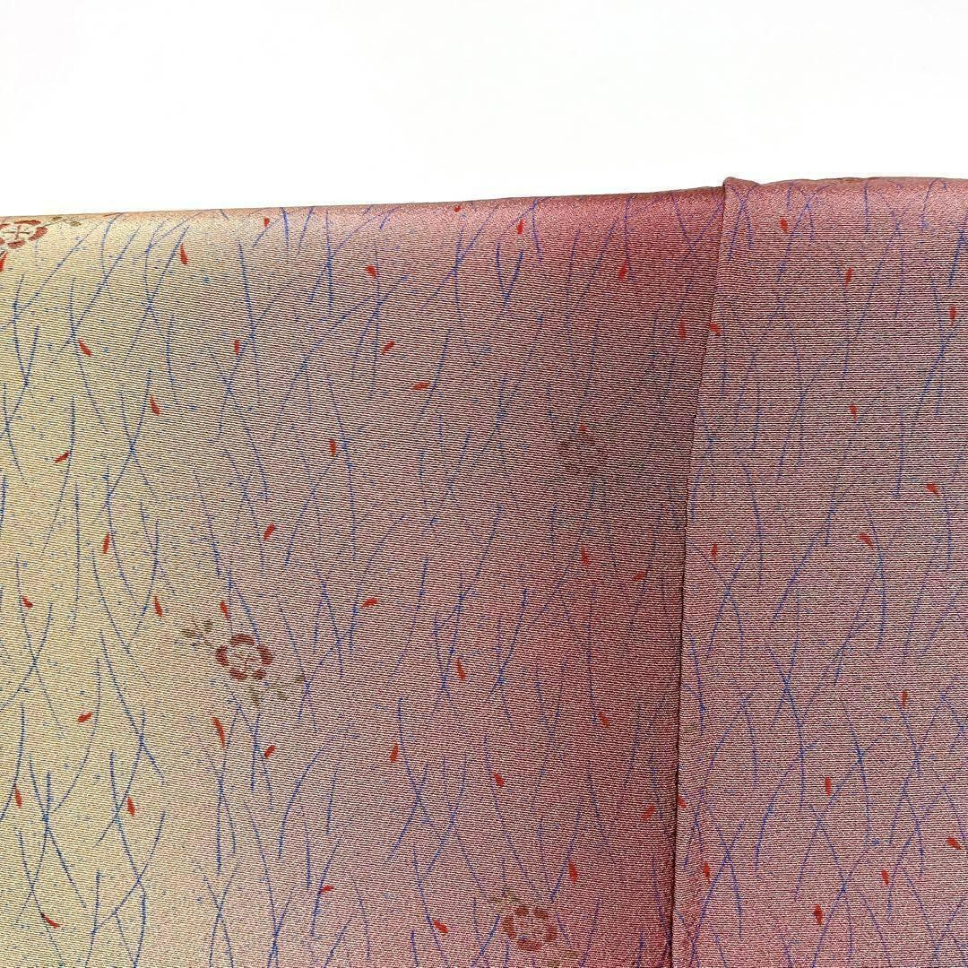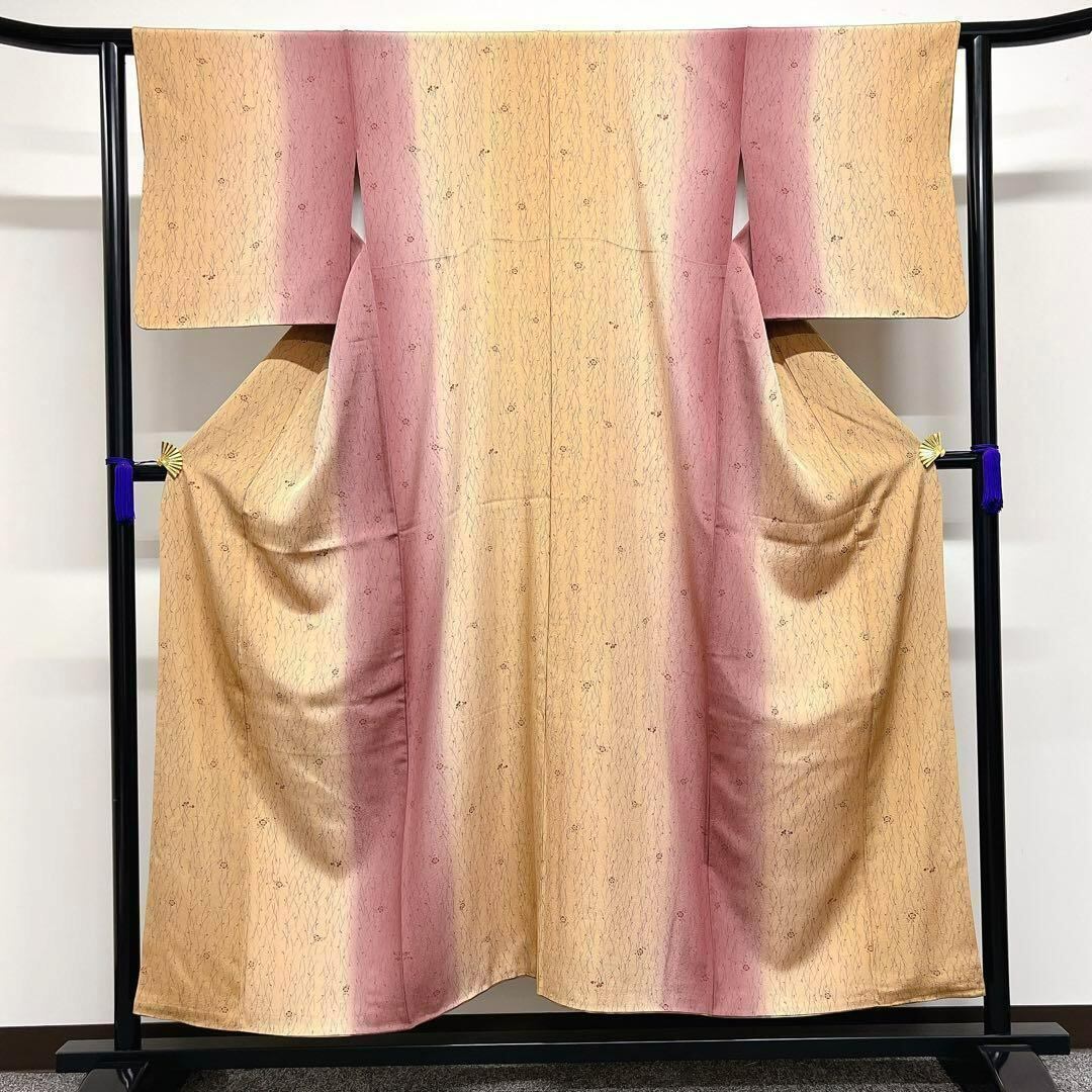グラデーションと小花の小紋です。くすみのあるキャラメル色と紫色地の縦縞のグラデーションに子花模様が散りばめられた味わいのある一着となっております。