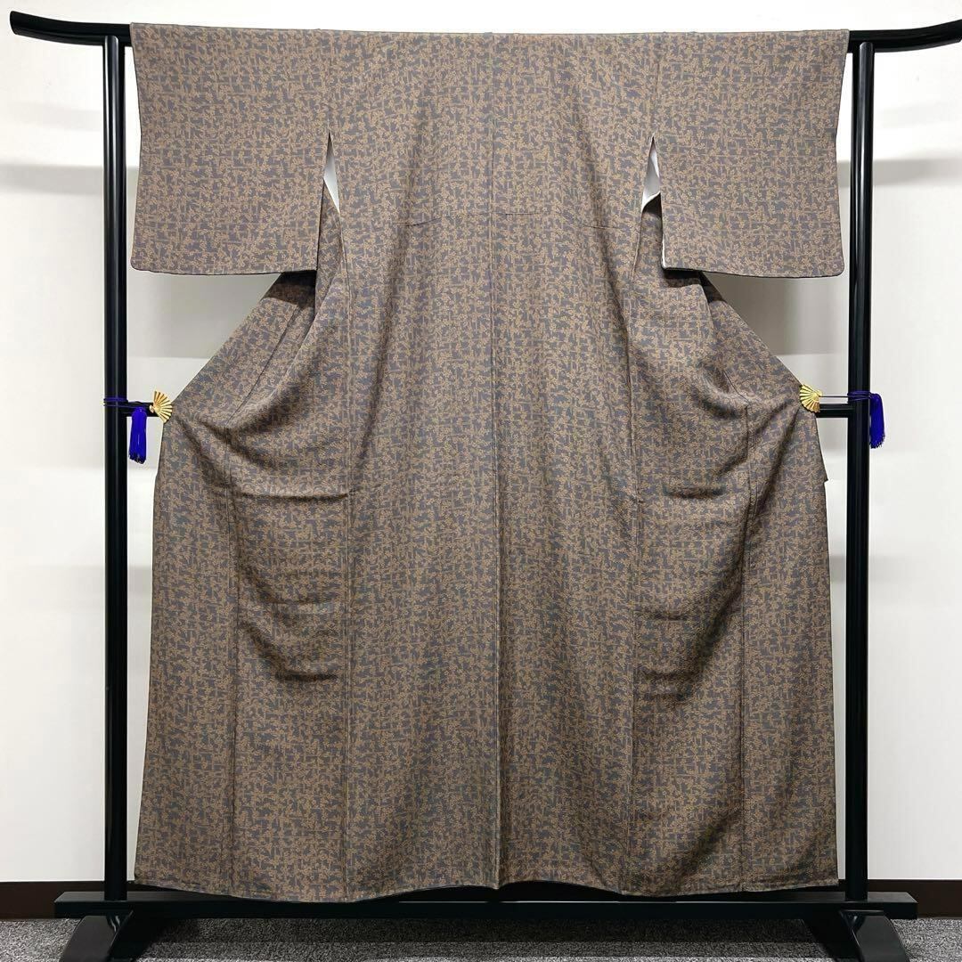 グレー地にくすんだ濃い黄色で描かれた二本線の格子と細やかや梅の花模様がお洒落な一着です。