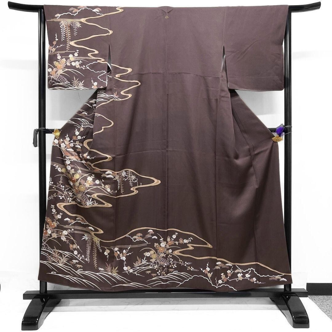 流水や松竹梅、藤の花、菊花が華やかにデザインされた一着です。