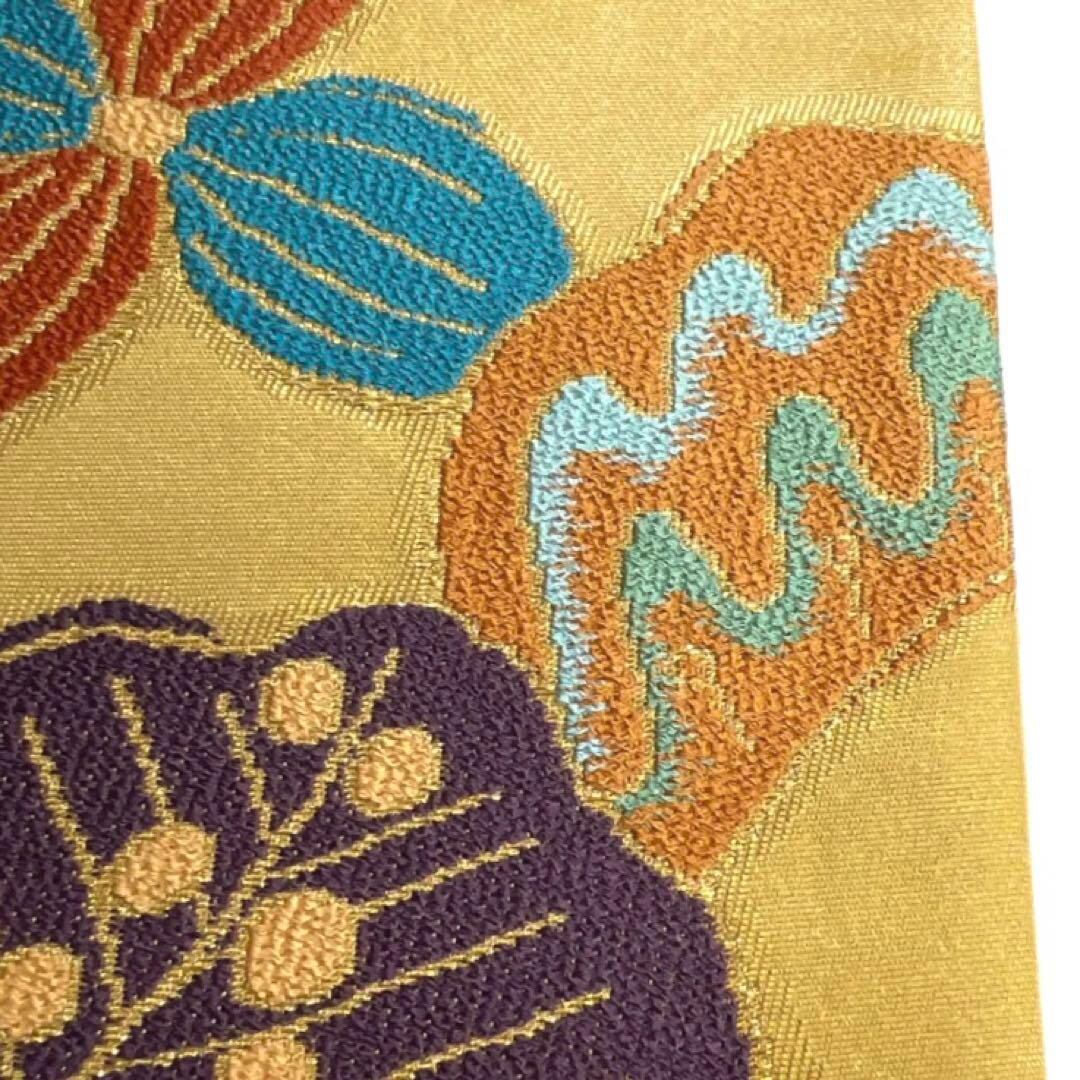 くすみのあるゴールドの地に鴛鴦と蝶に唐花とリーフが鮮やかなお色味で織られた華やかなデザインです。