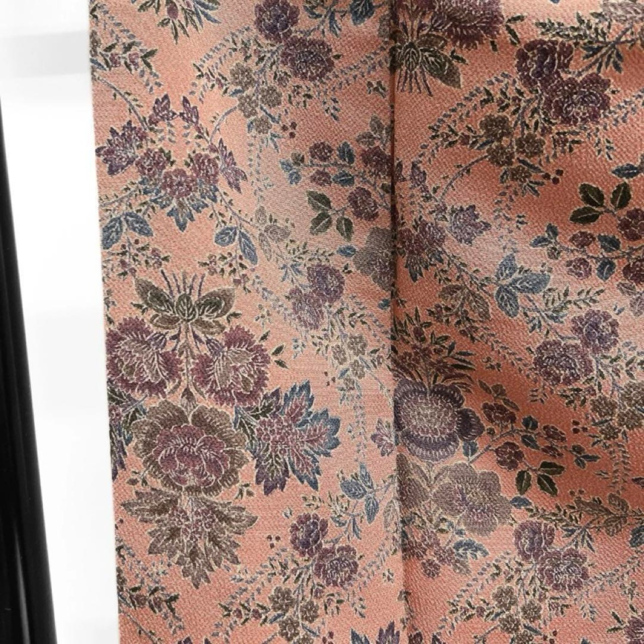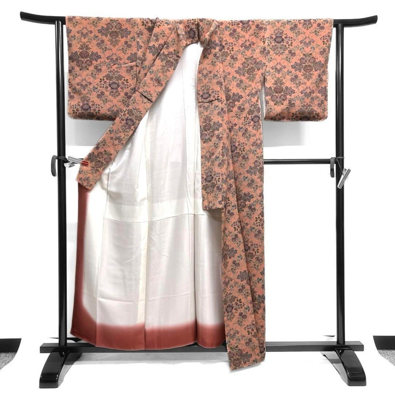くすみカラーのオレンジ地に菱取りのように描かれた唐花模様がお洒落なデザインの一着です。