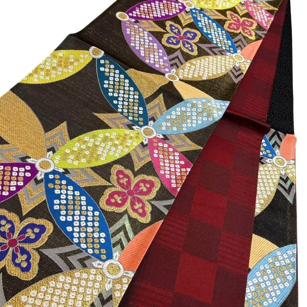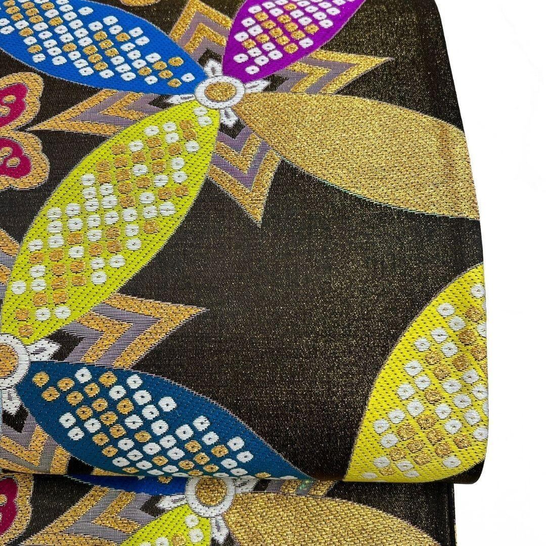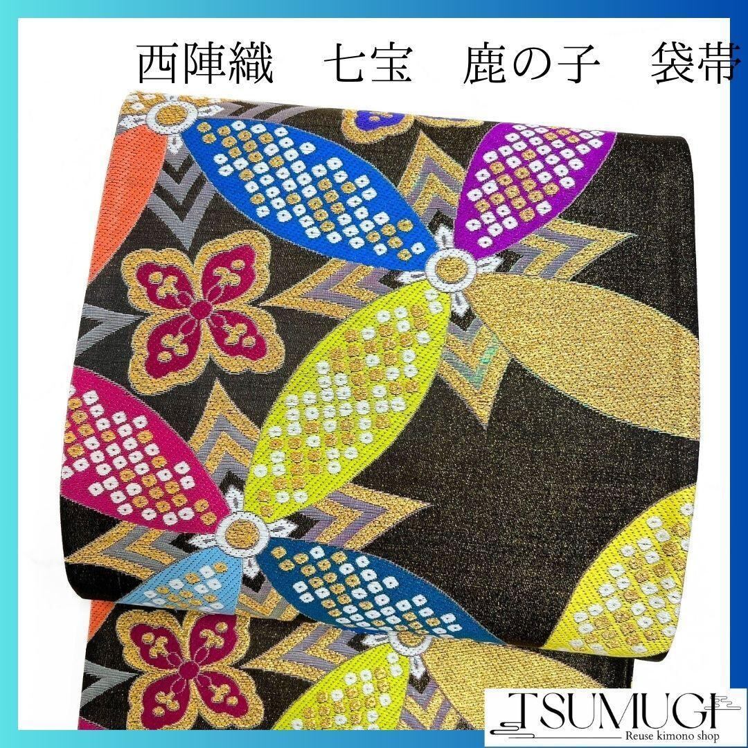 未着用、西陣織で七宝や花菱、鹿の子が織り出された振袖帯です。