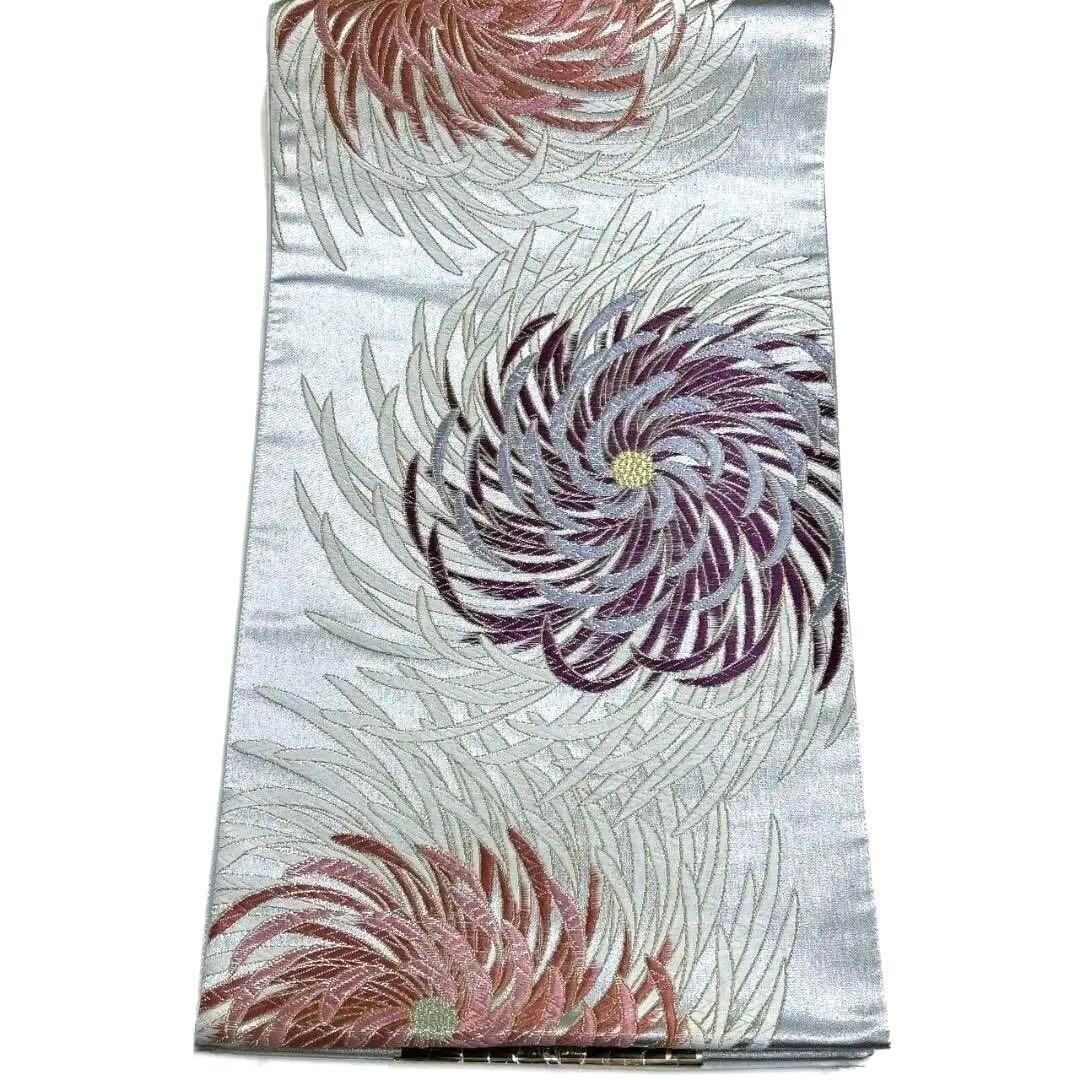 銀地に紫とピンクの乱菊が華やかなデザインとなっております。