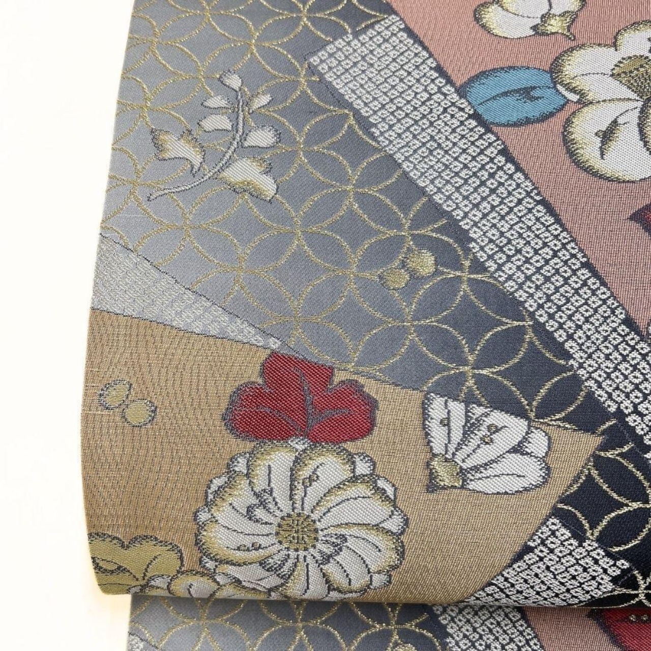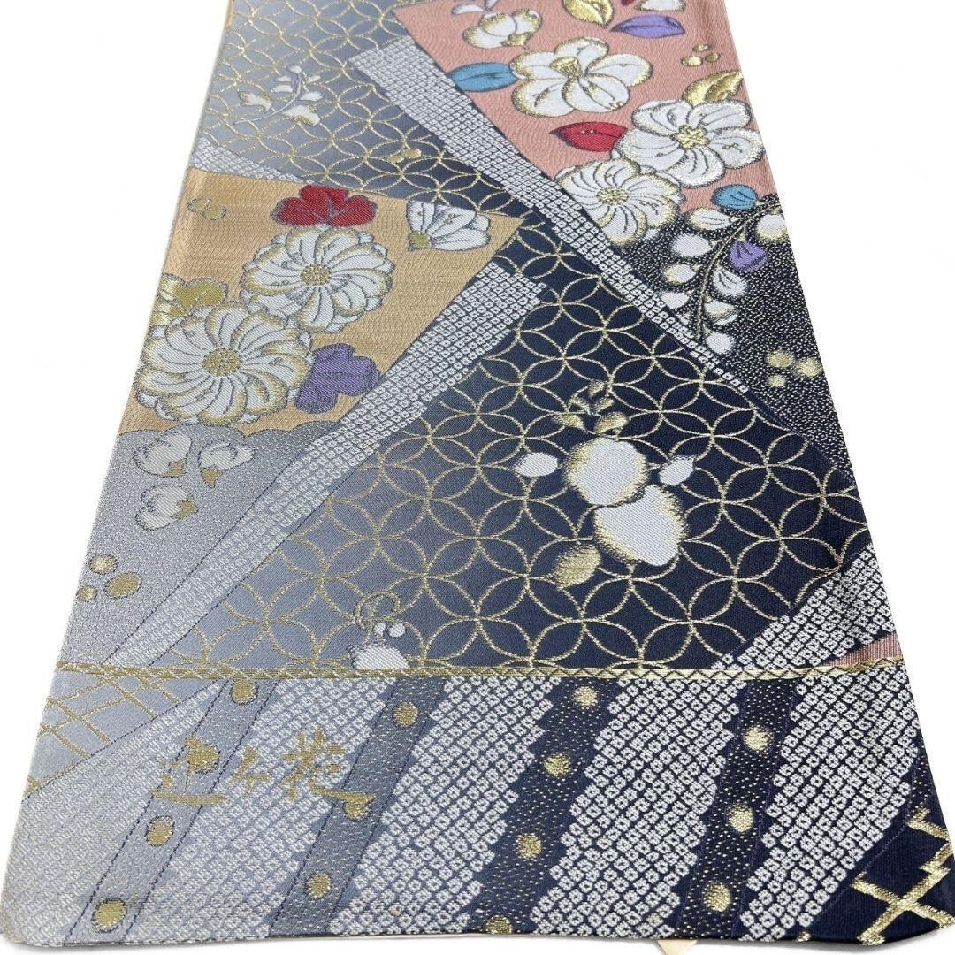 未着用、西陣織で辻ヶ花や椿、七宝が織り出された袋帯です。