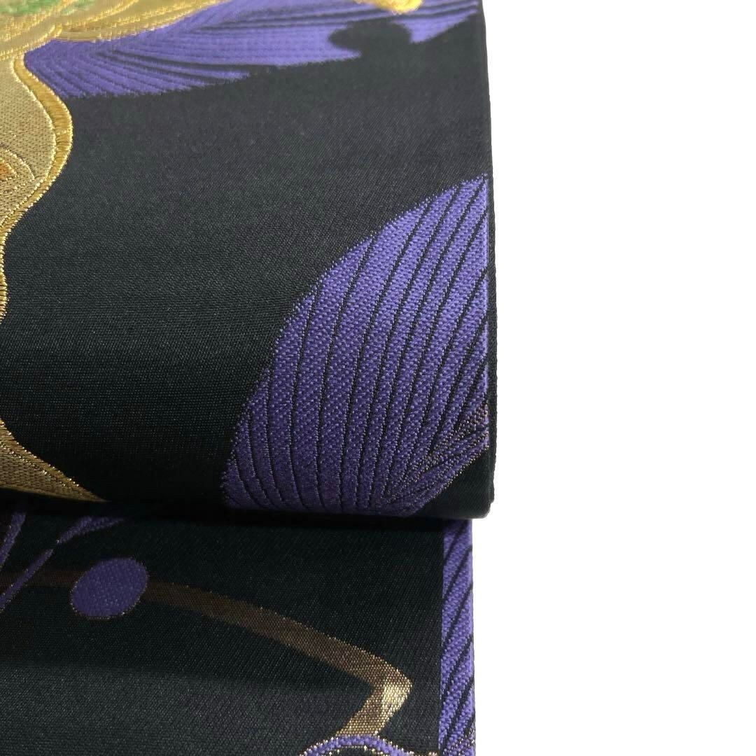 黒地に金で織られた花模様と蝶の文様にパープルのリーフ模様が華やかなデザインの一着です。