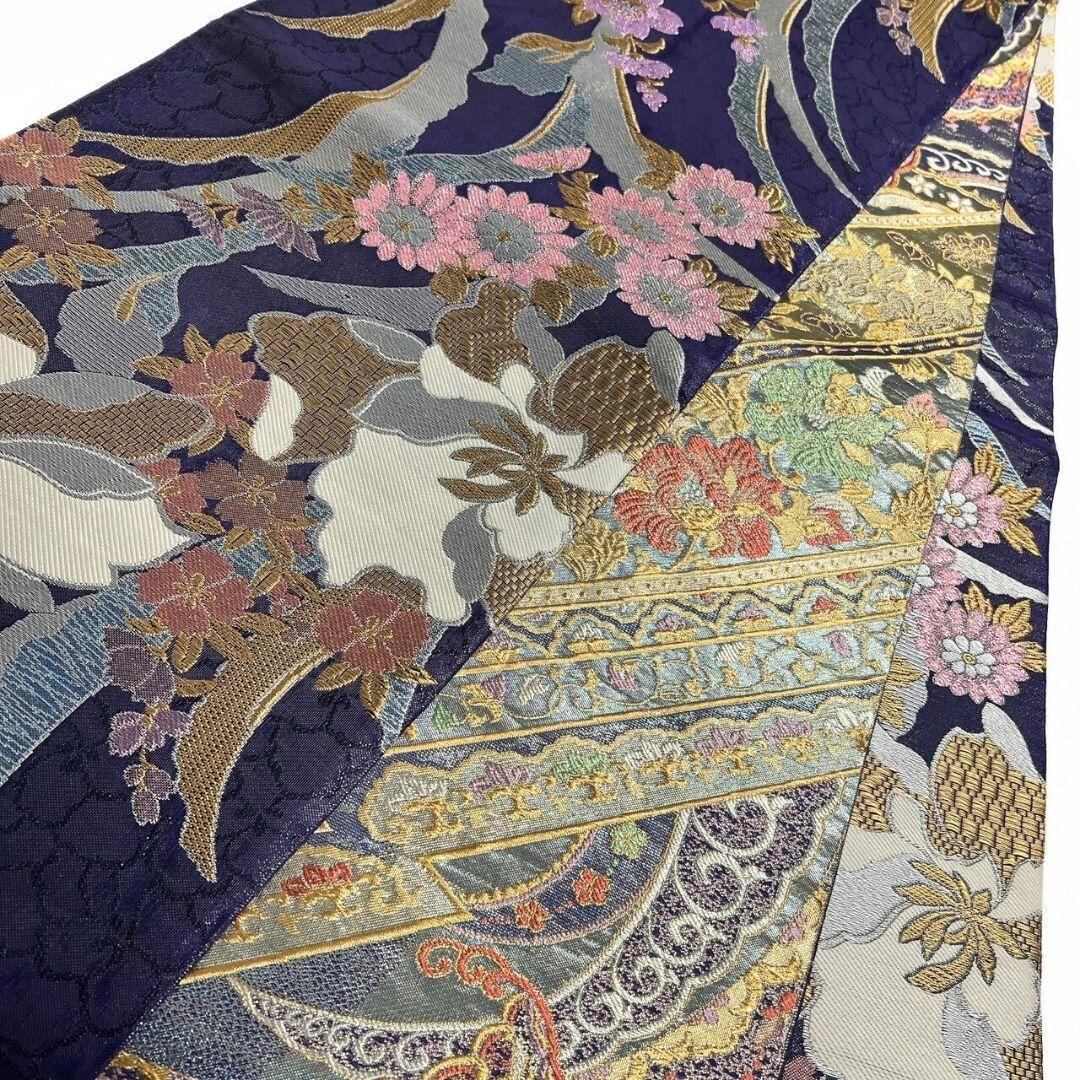 リバーシブルの百合や菊花、桜花模様、唐花が織り出された振袖帯です。