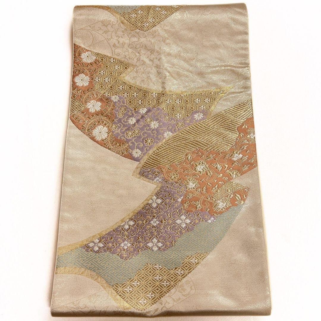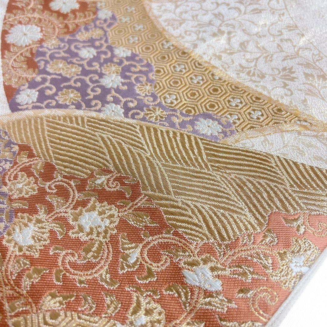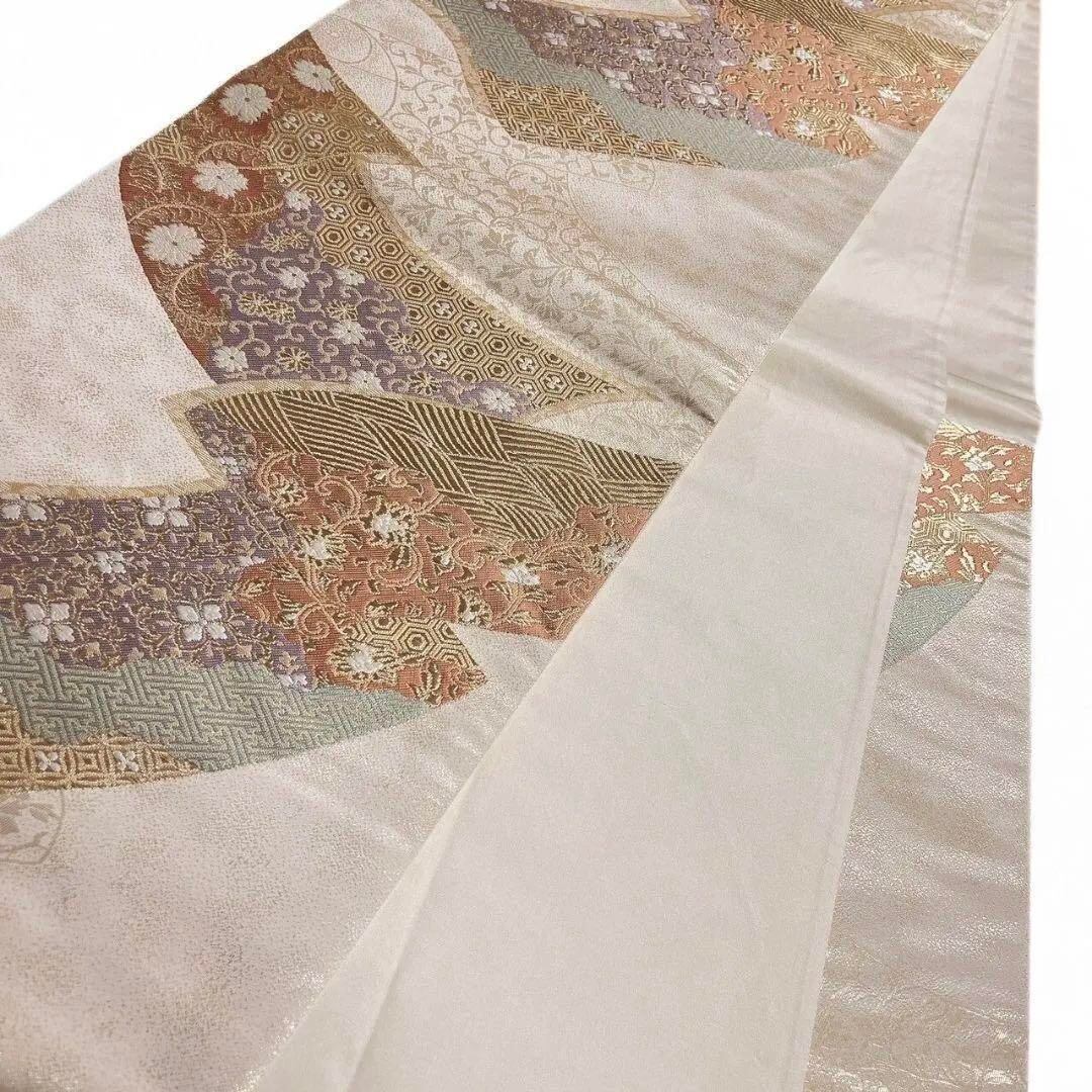 熨斗に七宝や紗綾形、唐花、亀甲が織り出された袋帯です。