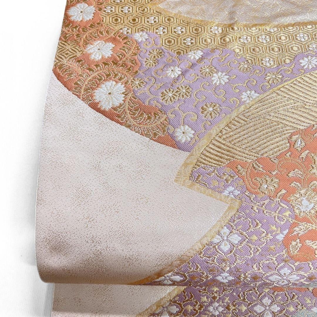 淡い華やかなお色味に細やかな伝統和模様が美しく織られた一着です。