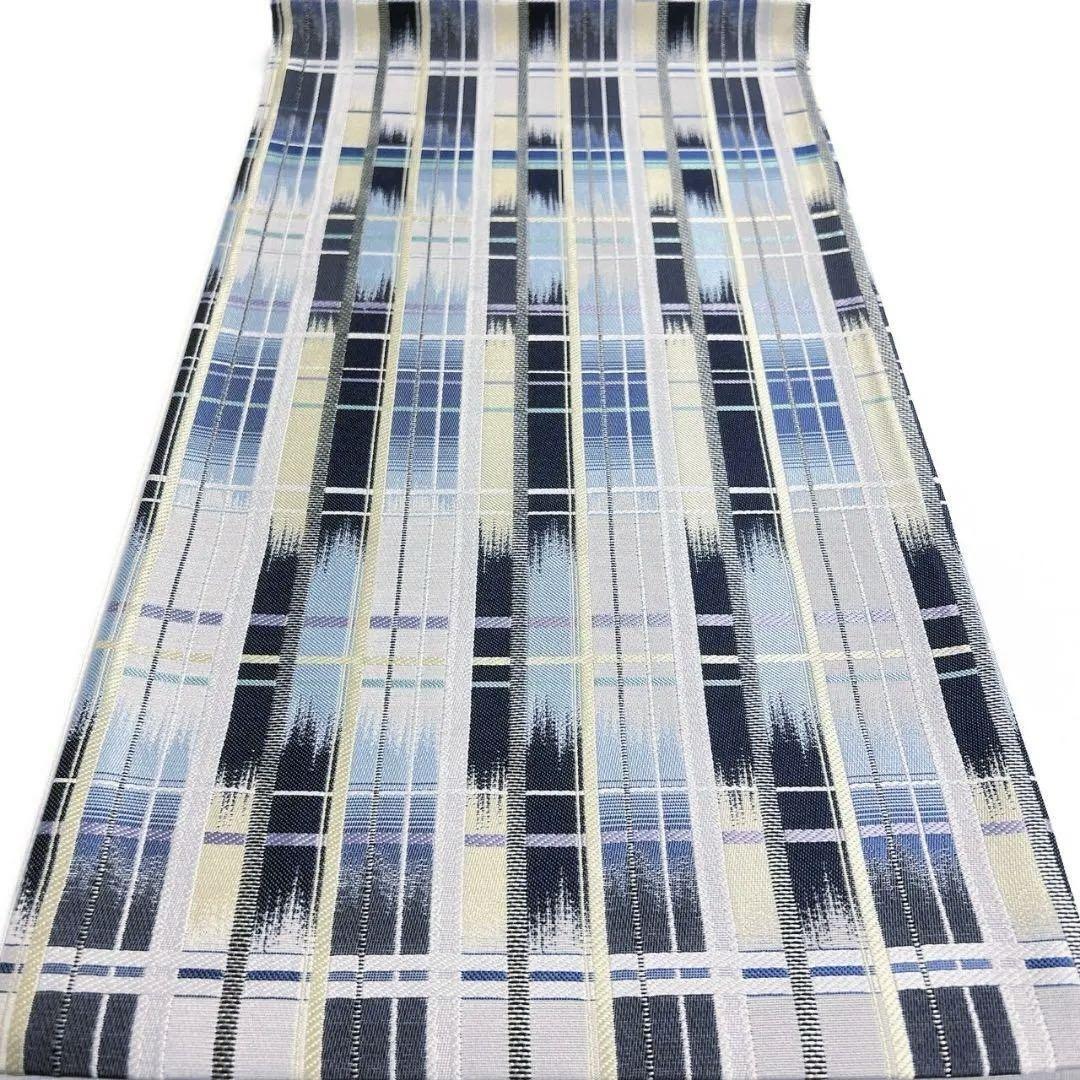 未着用のチェック模様に絣、縦縞が織り出された袋帯です。
