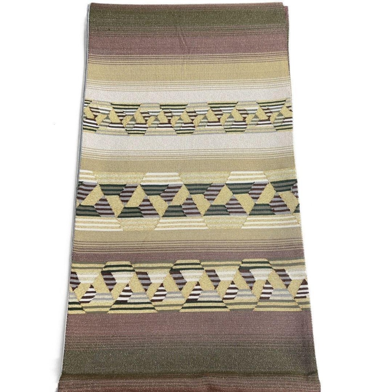 金通しに横縞、変わり抽象模様が織り出された袋帯です。