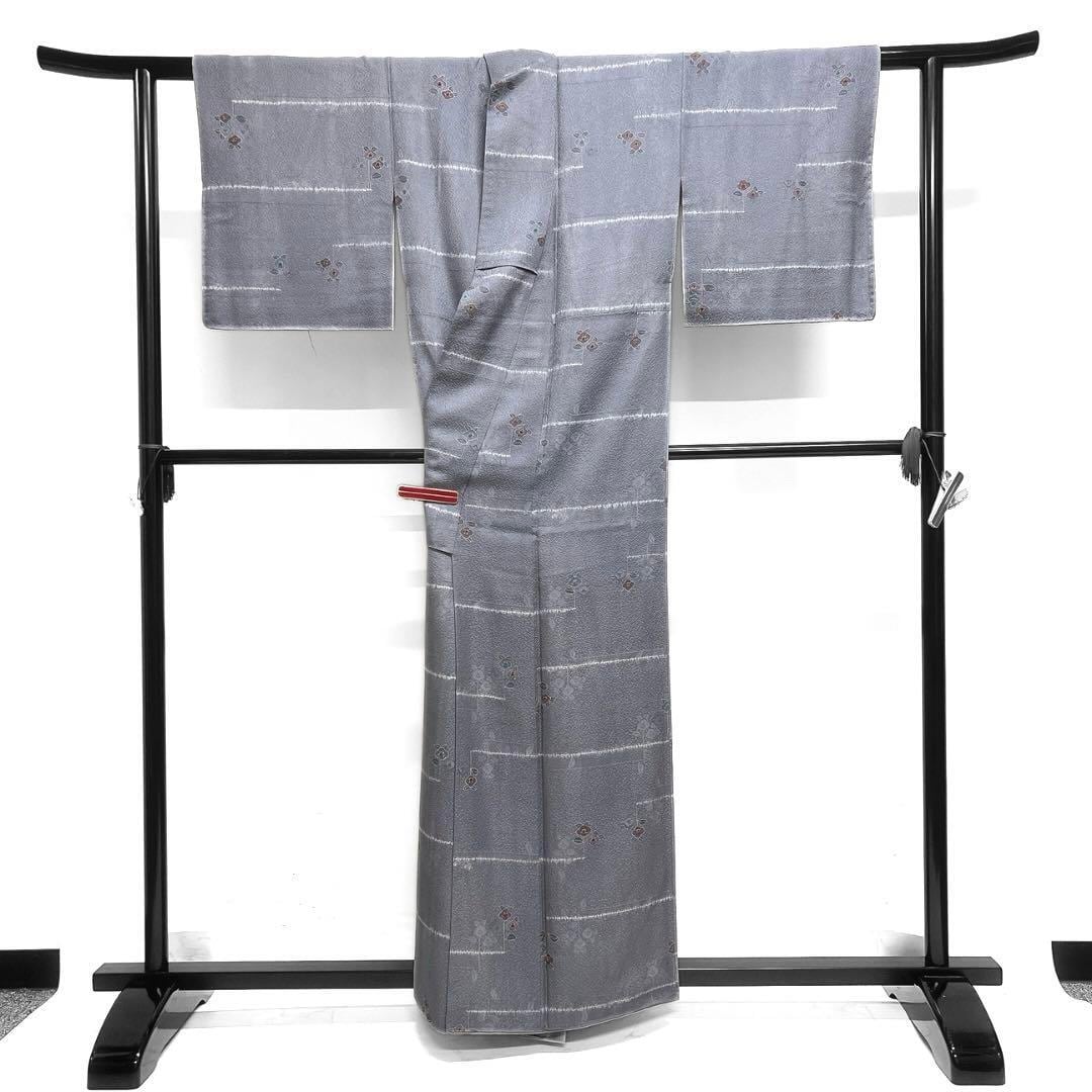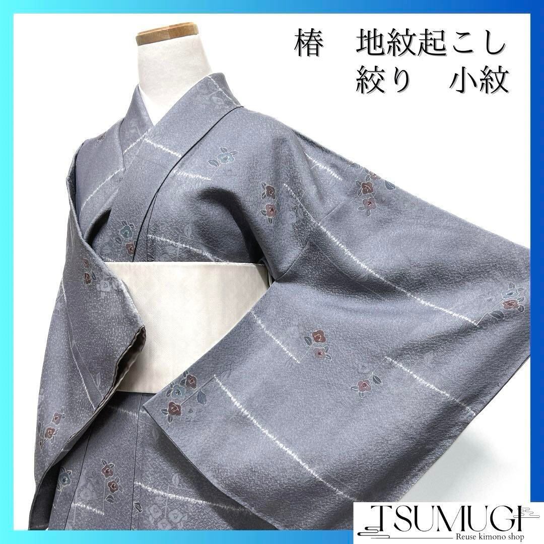 グレーの地に地紋起こしで描かれた椿の文様と絞りを交えた幾何学文様がお洒落なデザインの一着です。
