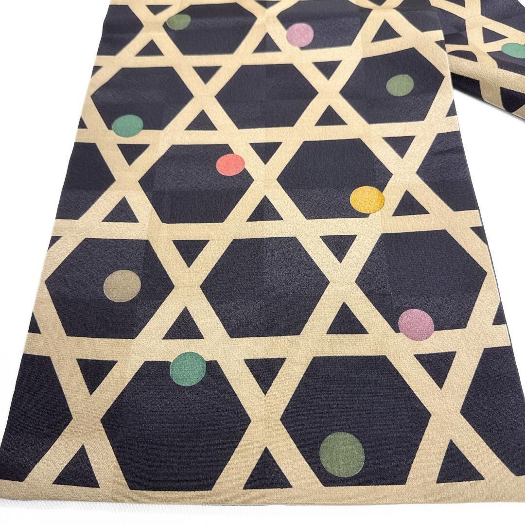 少し紫がかった黒と深いグレーの市松模様、ベージュの籠目に落ち着きのあるカラーのドットが描かれた名古屋帯です。