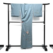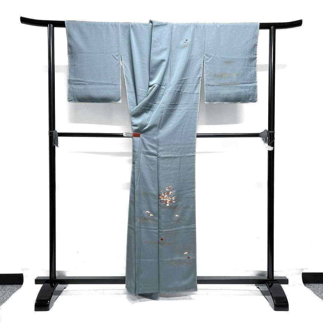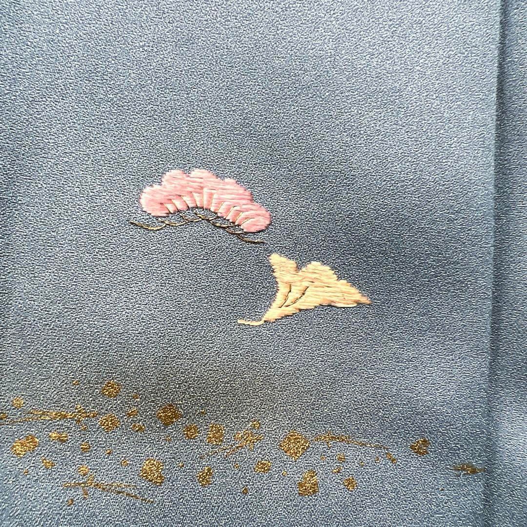 チョークブルーの地に金彩で描かれたのり散らしと刺繍で織られた梅と松に松葉、銀杏の文様が華やかなデザインの一着です。