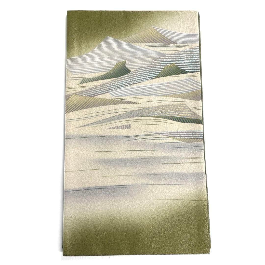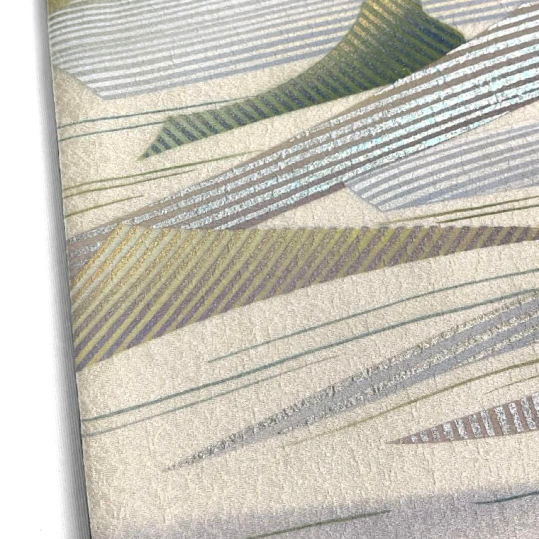 銀通しの深いくすみグリーンとホワイトの地に縞模様の抽象模様が描かれたお洒落なデザインの一着です。