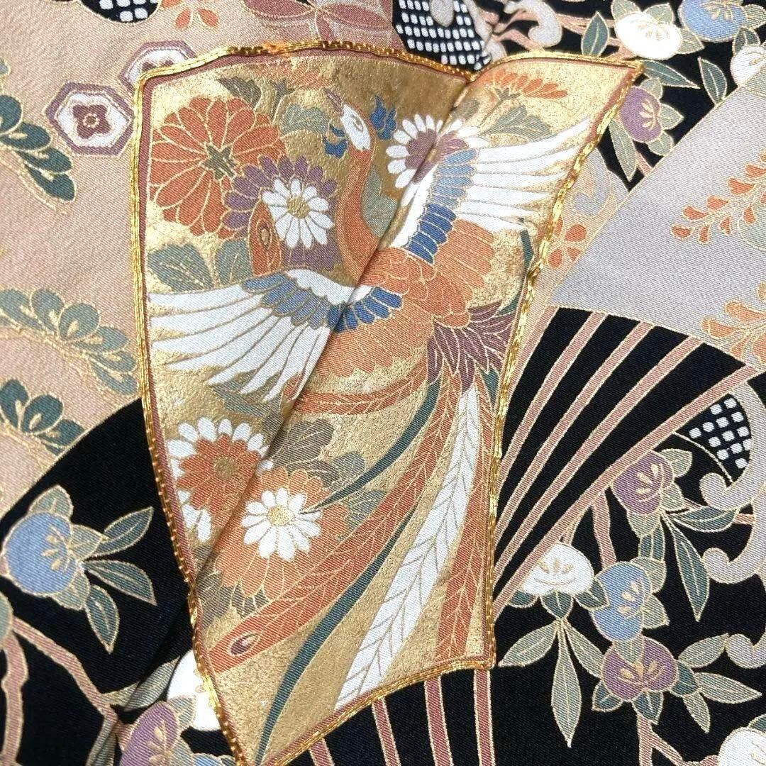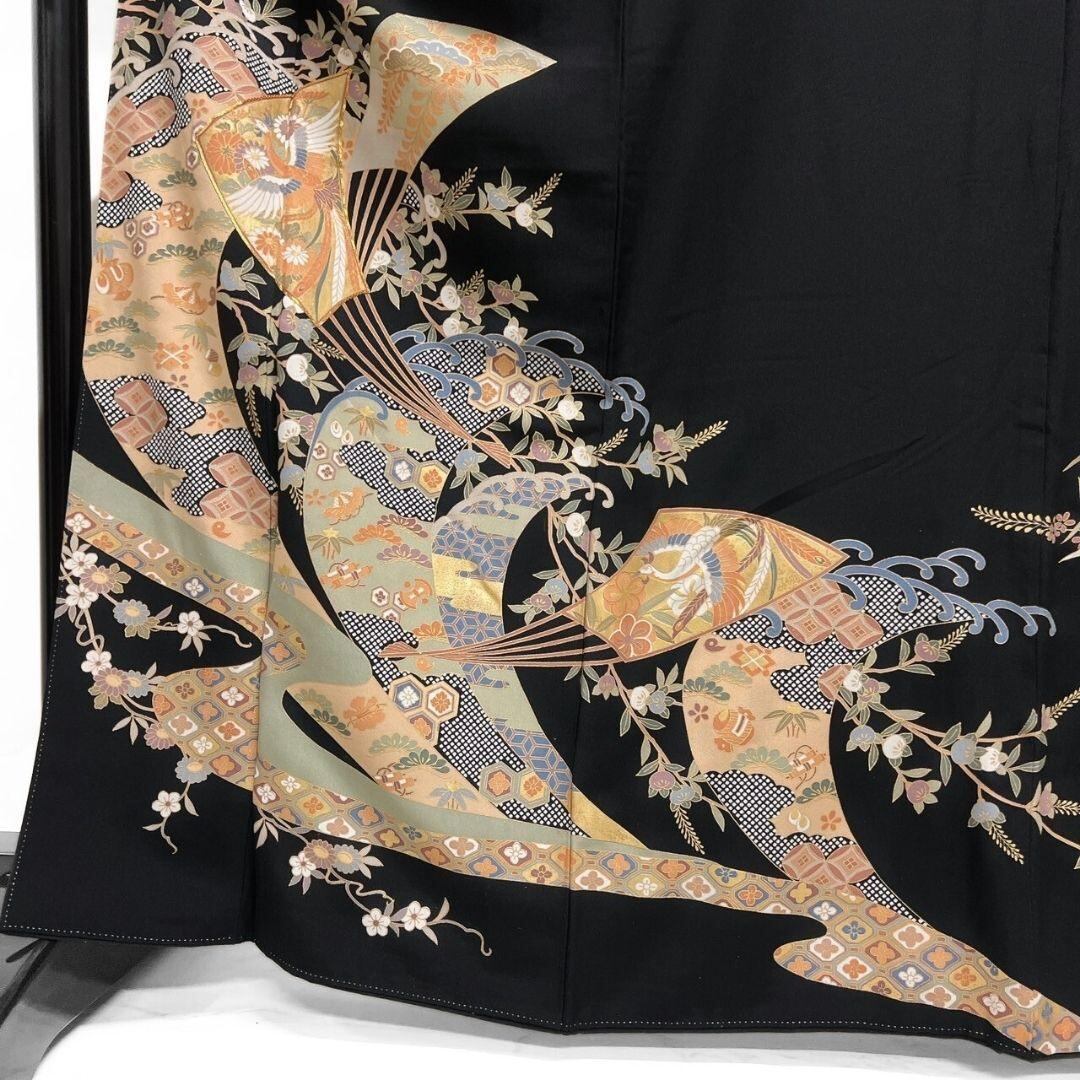 金駒刺繍があしらわれた扇が描かれた黒留袖です。