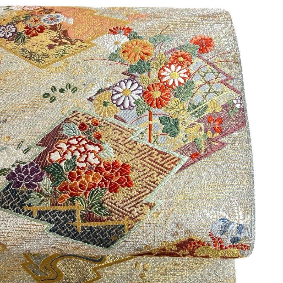 唐花模様、松川菱、菊花が織り出された袋帯です。