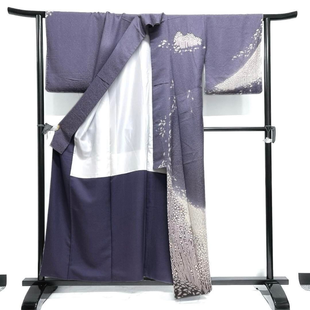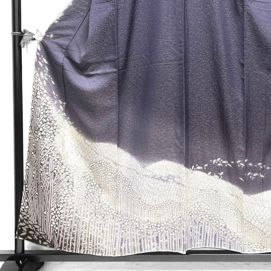 深いくすみの紫の金通し地に絞りと相良刺繍で描かれた抽象的な木々や花模様の風景模様が華やかなデザインの一着です。