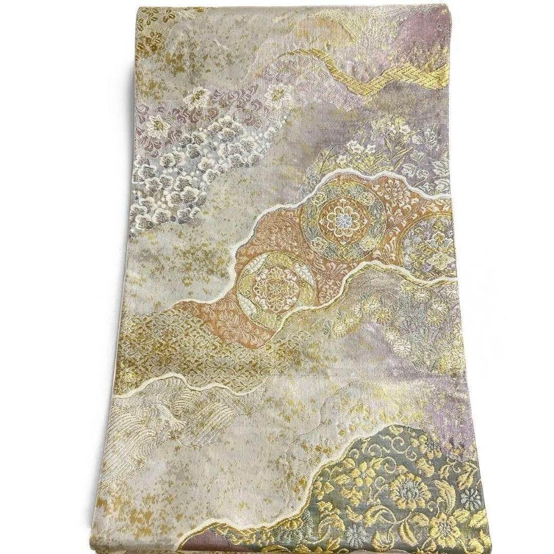 霞取りに花紋や梅花、唐花、波模様が織り出された袋帯です。