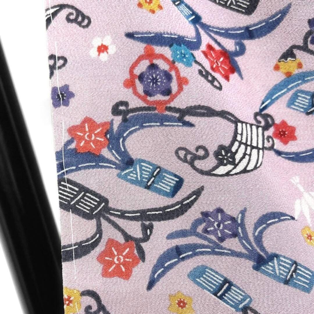 アイリスカラーの地に型染で描かれた花模様に梅花や竹、扇に水引、冊子の文様がお洒落なデザインの一着です。