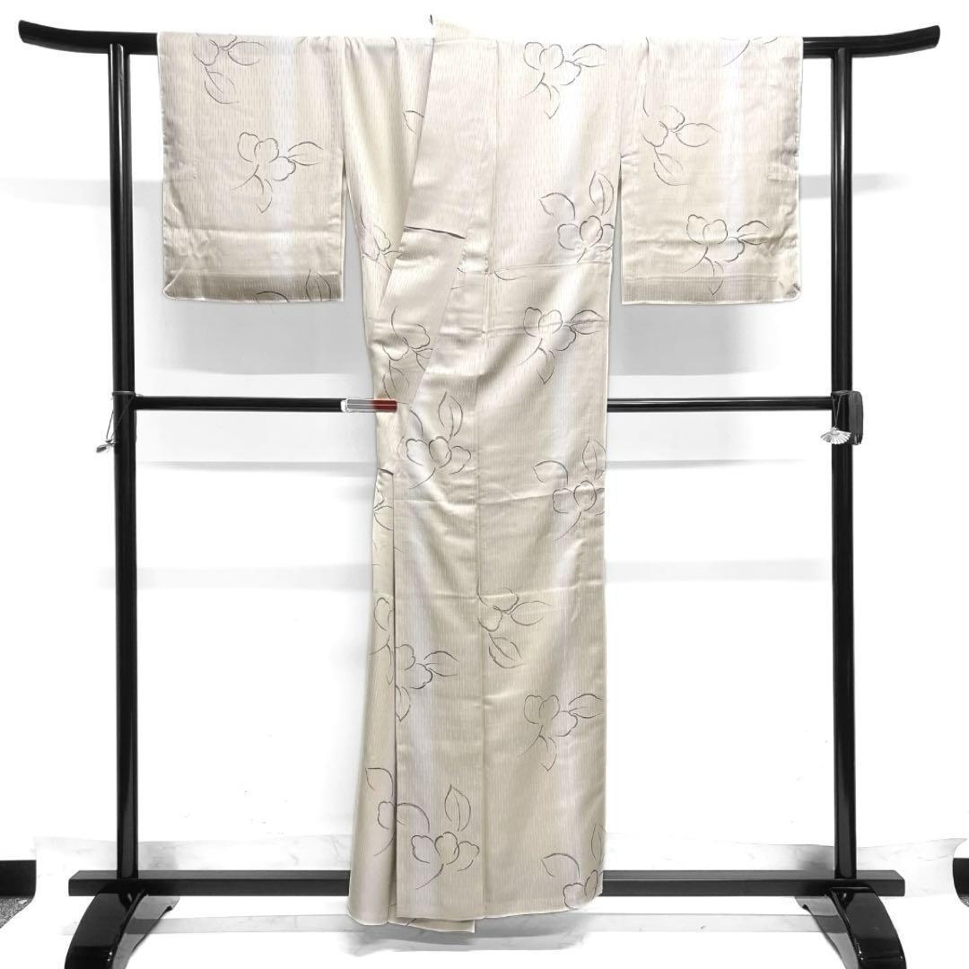 柔らかな生地の淡く薄いベージュとホワイトのグラデーション縦縞地紋に抽象的な花模様が描かれたお洒落なデザインの一着です。