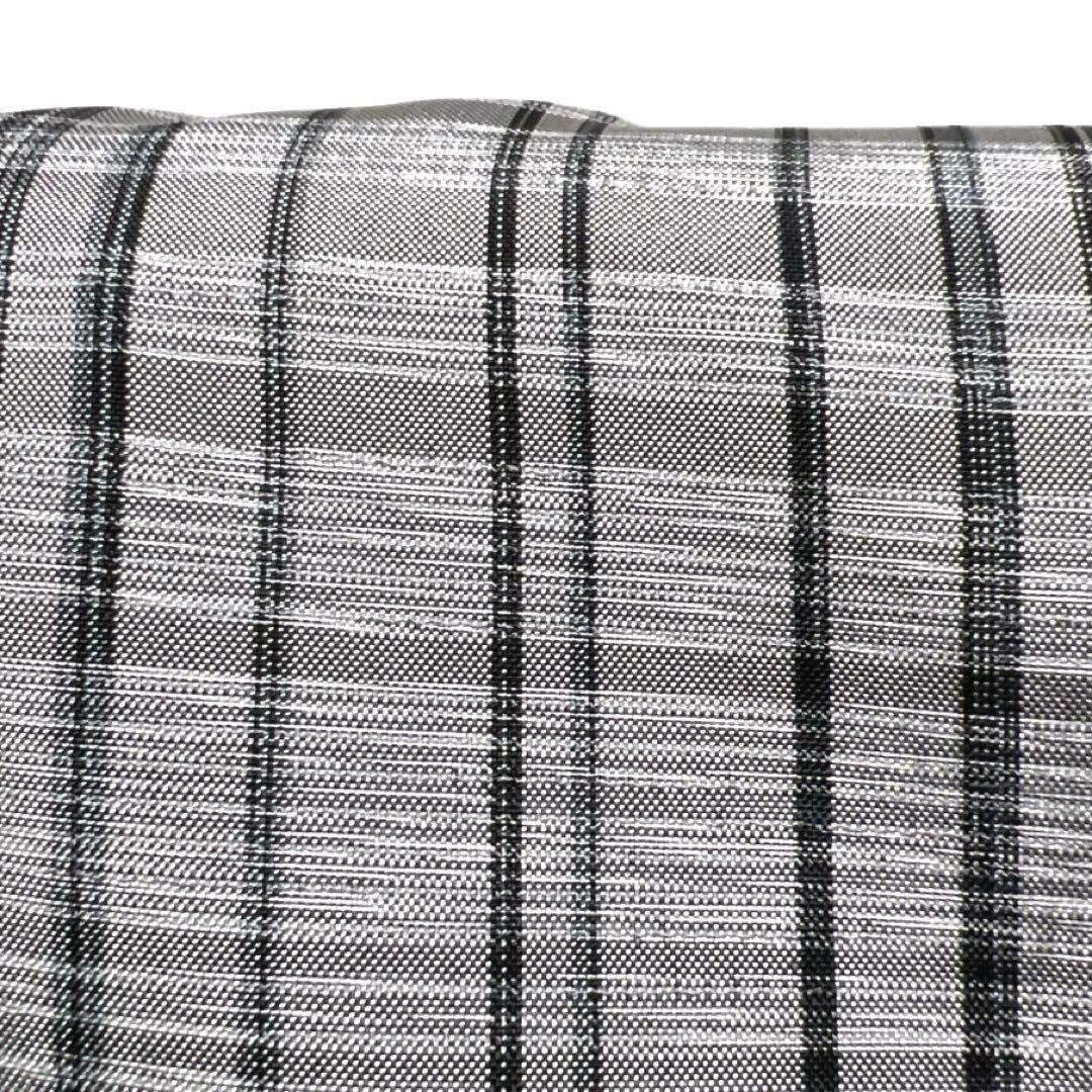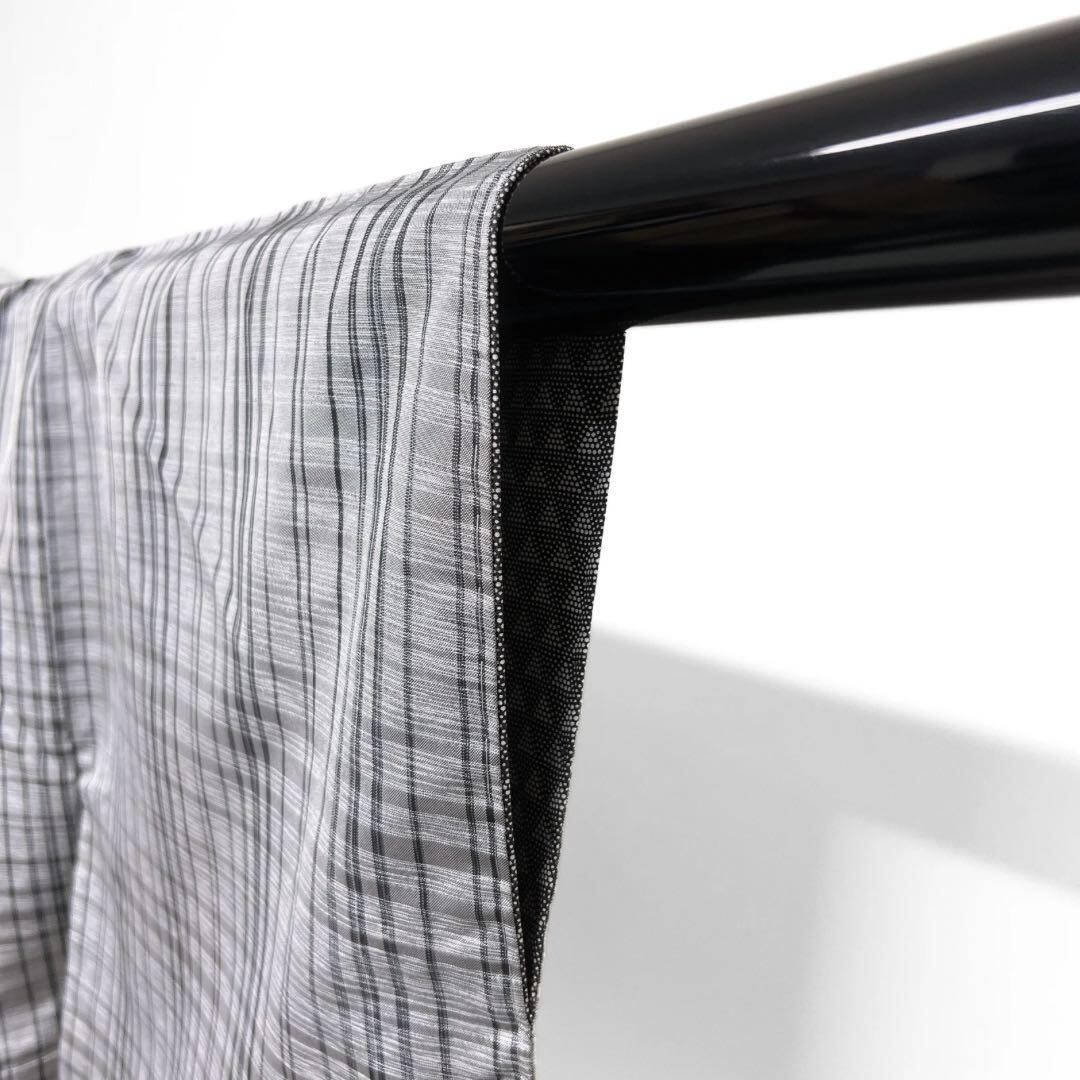 グレーの紬地に薄いグレーの横縞と黒の縦縞によるチェック模様がお洒落なデザインの一着です。