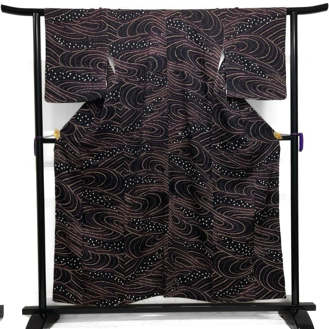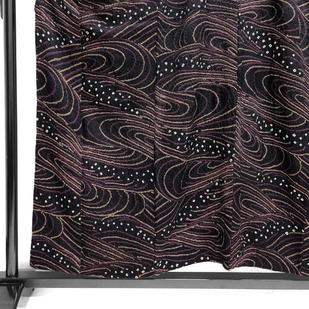 紗綾形地紋の黒地に総絞りで描かれたパープルとサーモンピンクの流水の文様がお洒落なデザインの一着です。