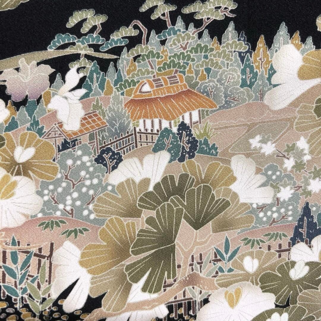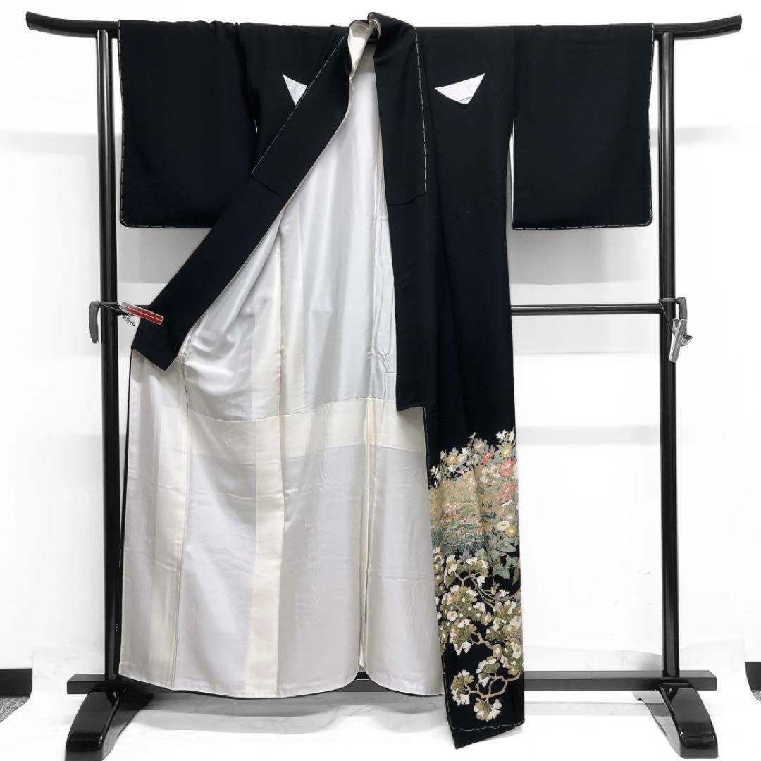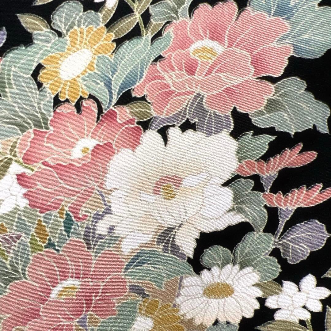 黒地に映える鮮やかな牡丹や菊の文様と茶屋辻の文様が華やかなデザインの一着です。