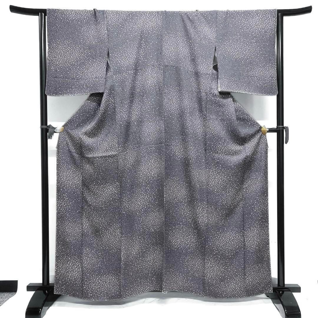 ちりめんのグレーに近いくすみ紫地に映えるのり散らしの文様が描かれたお洒落なデザインの一着です。