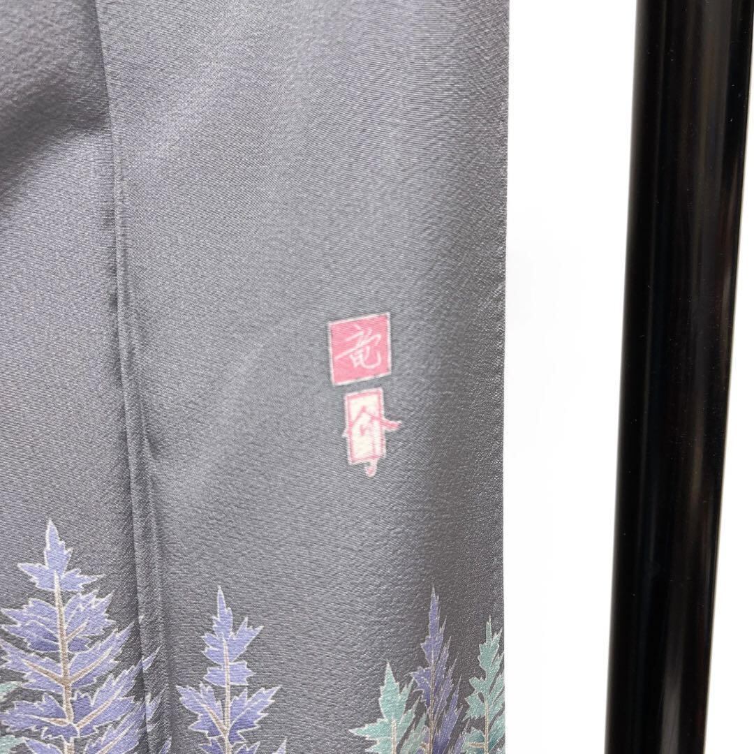 グレーの地に映える木々に松や梅、楓に鶴の風景模様が友禅染で描かれた華やかなデザインの一着です。