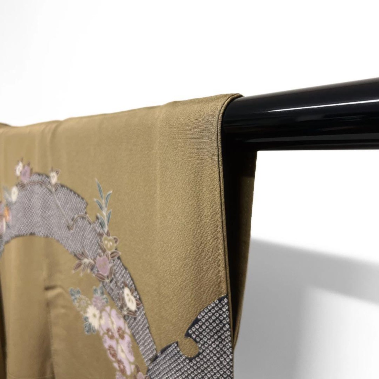 くすんだ黄色の地に露芝に鹿の子と金駒刺繍を交え描かれた桜と菊や橘が華やかなデザインの一着です。