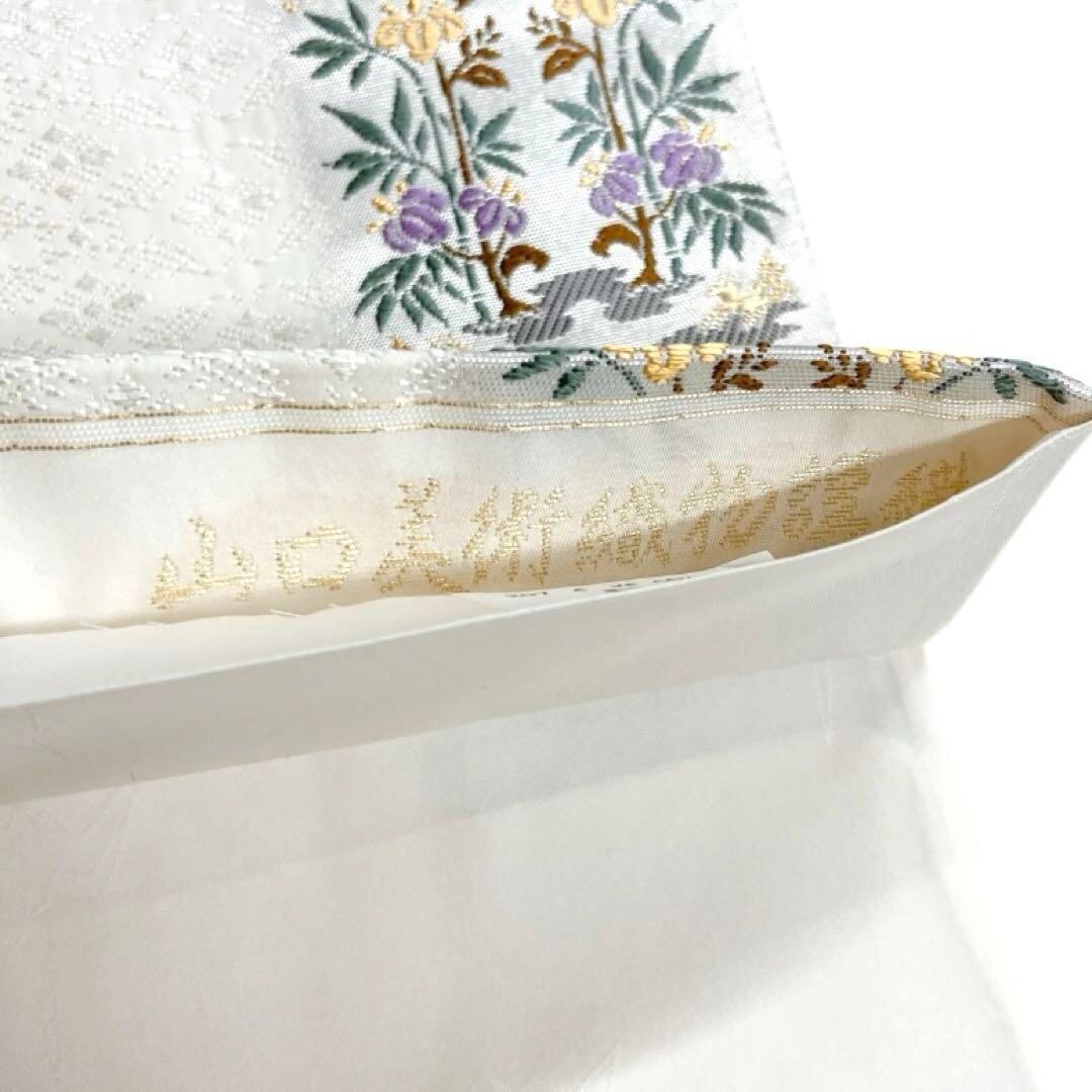 山口美術織物 白地に桐の花、鳳凰、竹の描かれた袋帯です。