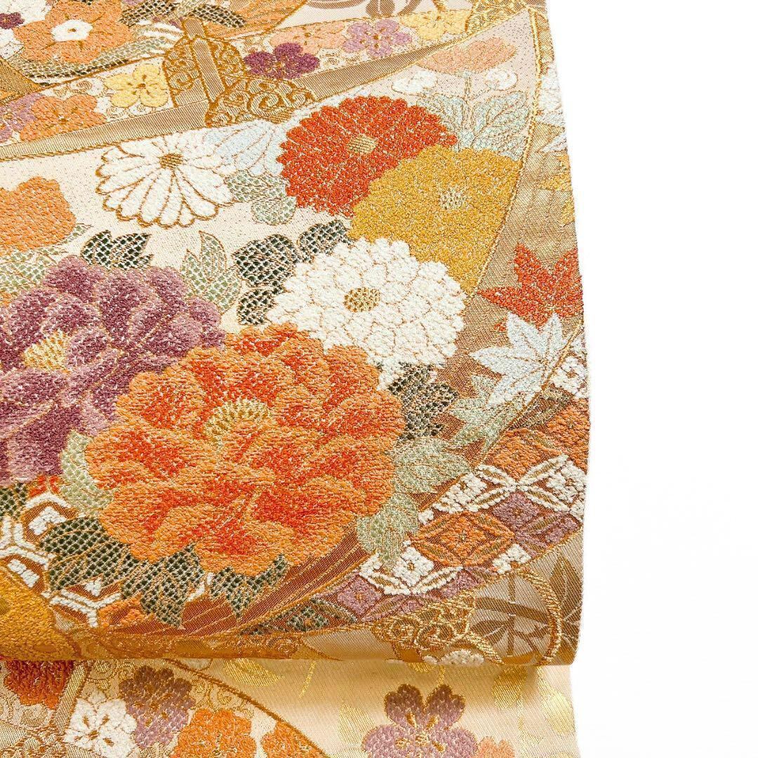 牡丹、菊花、桜花、花菱が華やかに織り出された袋帯です。