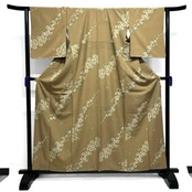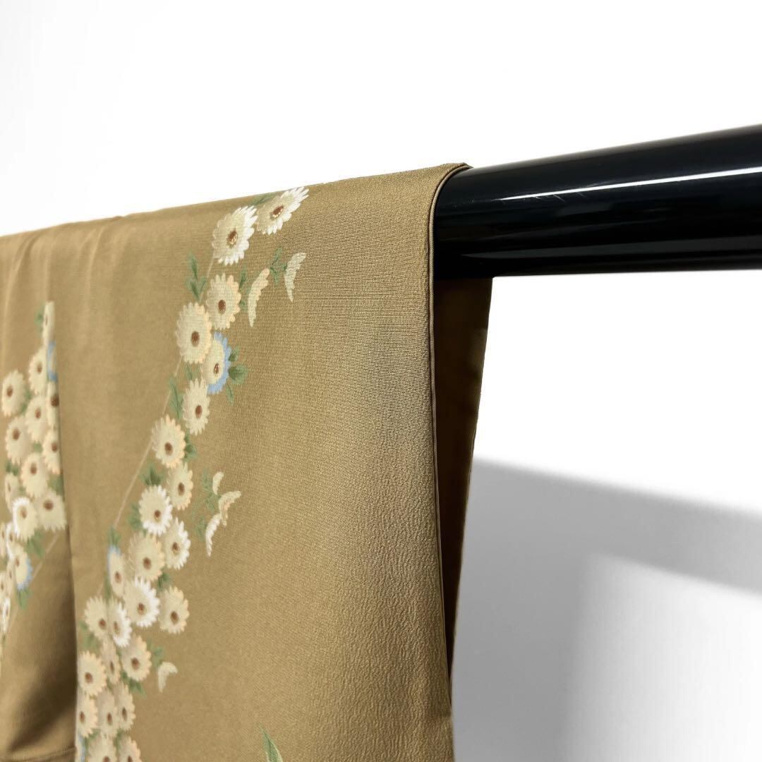 オリーブカラーの地に描かれた菊花とリーフの文様に斜線の竹筋がお洒落なデザインの一着です。