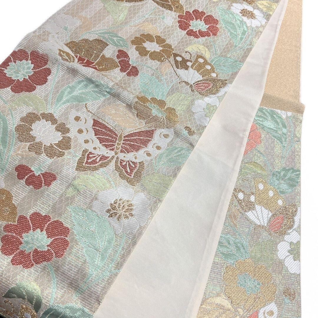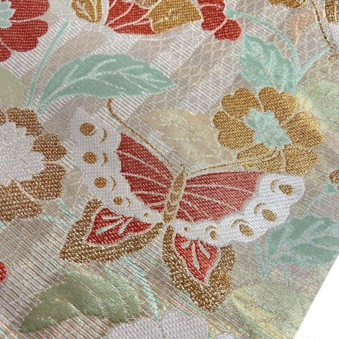 未着用の縦縞に花模様や蝶が織り出された袋帯です。